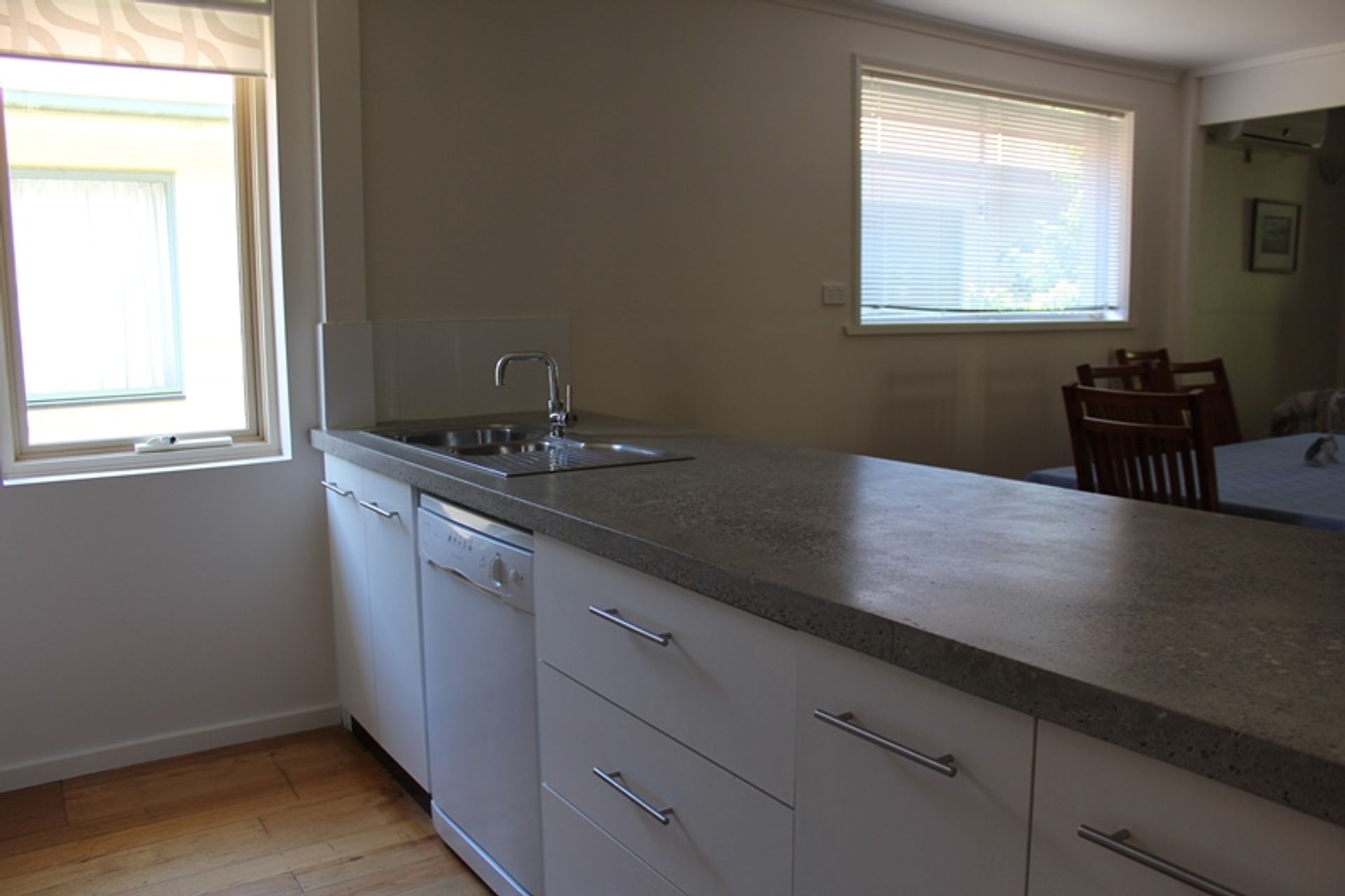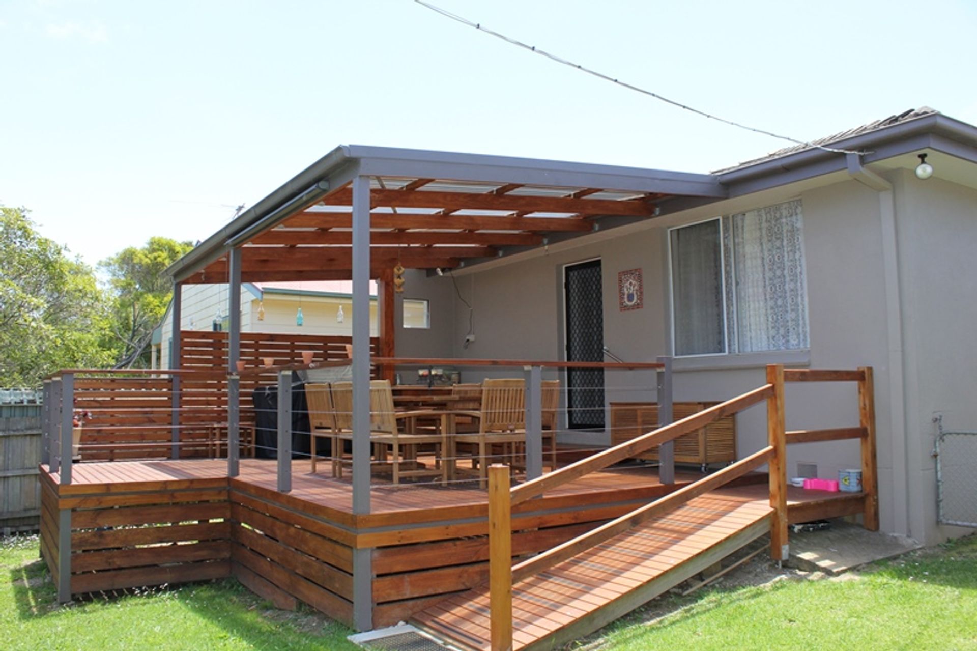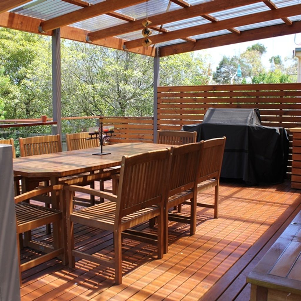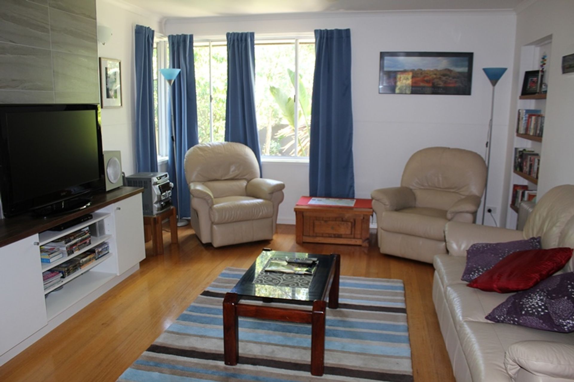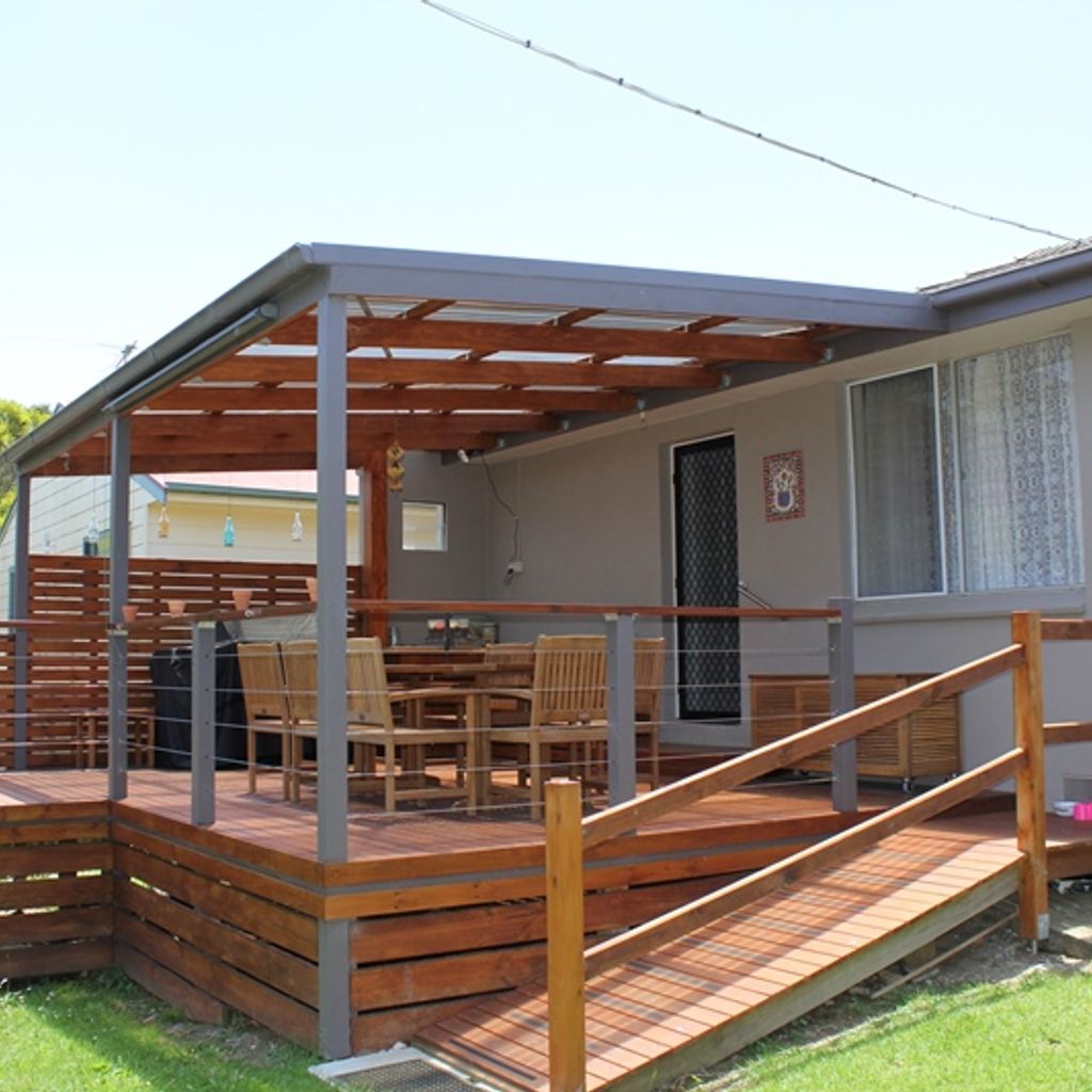 Inside the lounge, dining and kitchen are open plan with a large flat screen tv and dvd player, comfortable sofas and stereo. There is a split system heating and cooling unit and polished timber floors. There is a central dining table and the kitchen is modern and well equipped. The kitchen has electric cooking, a microwave and dishwasher. The fridge is a good size and there are lots of platters and salad bowls perfect for alfresco dining. The deck is at the rear of the house with a large outdoor setting, a gas bbq, outdoor sink and crockery and cutlery - the perfect spot for summer bbqs.