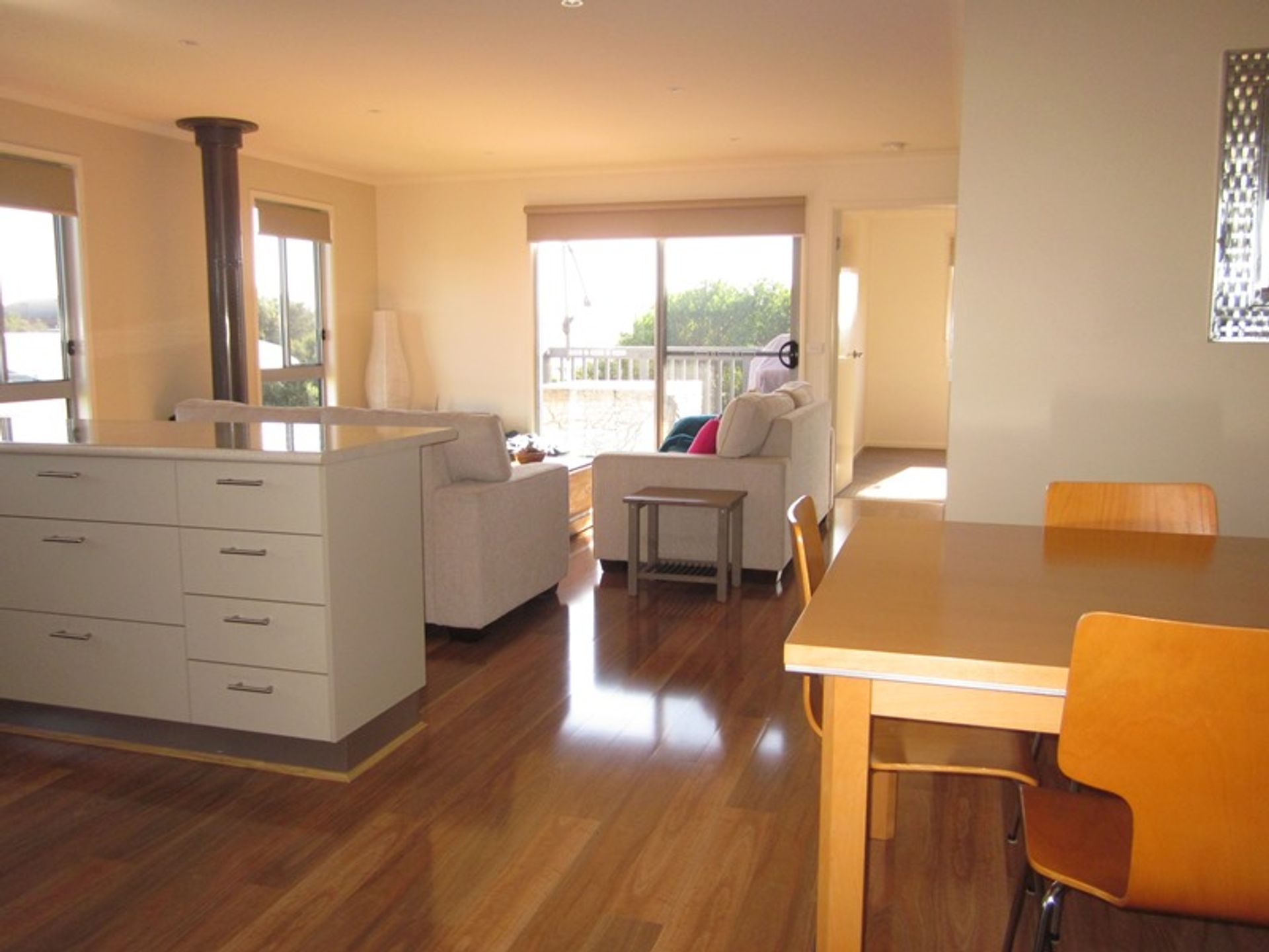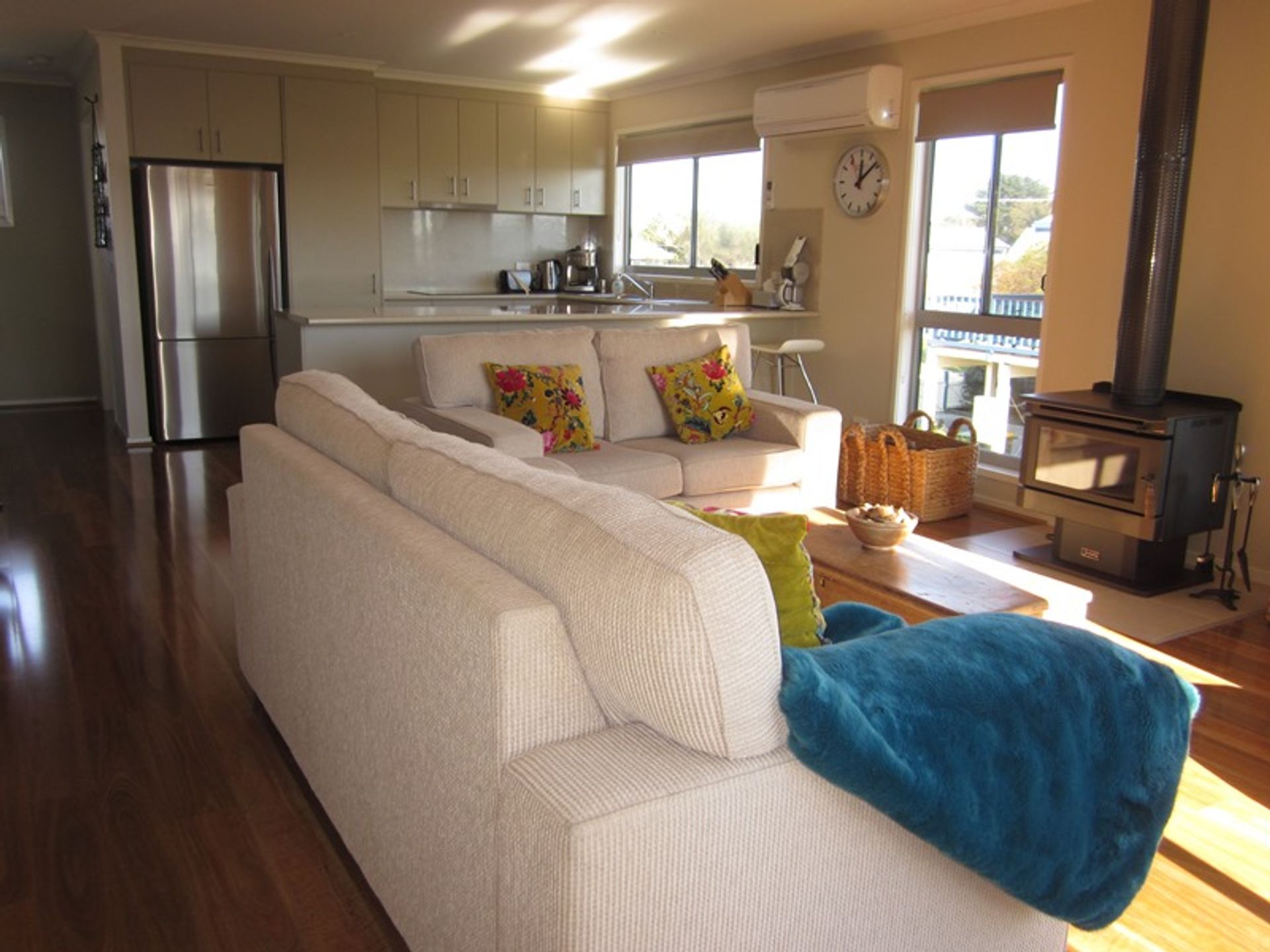 Upstairs is the open plan kitchen/living area. The fully equipped kitchen has a microwave, dishwasher, electric stove/oven and a full complement of utensils and cooking equipment. The main dining table inside seats 8 comfortably, but there is also a large outdoor table on the deck for al fresco dining. The kitchen overlooks the living area with Pilbara fire for cosy winter nights, split system heating and cooling and large lounge suite, leading out to the decking with outdoor setting and family-sized gas bbq.