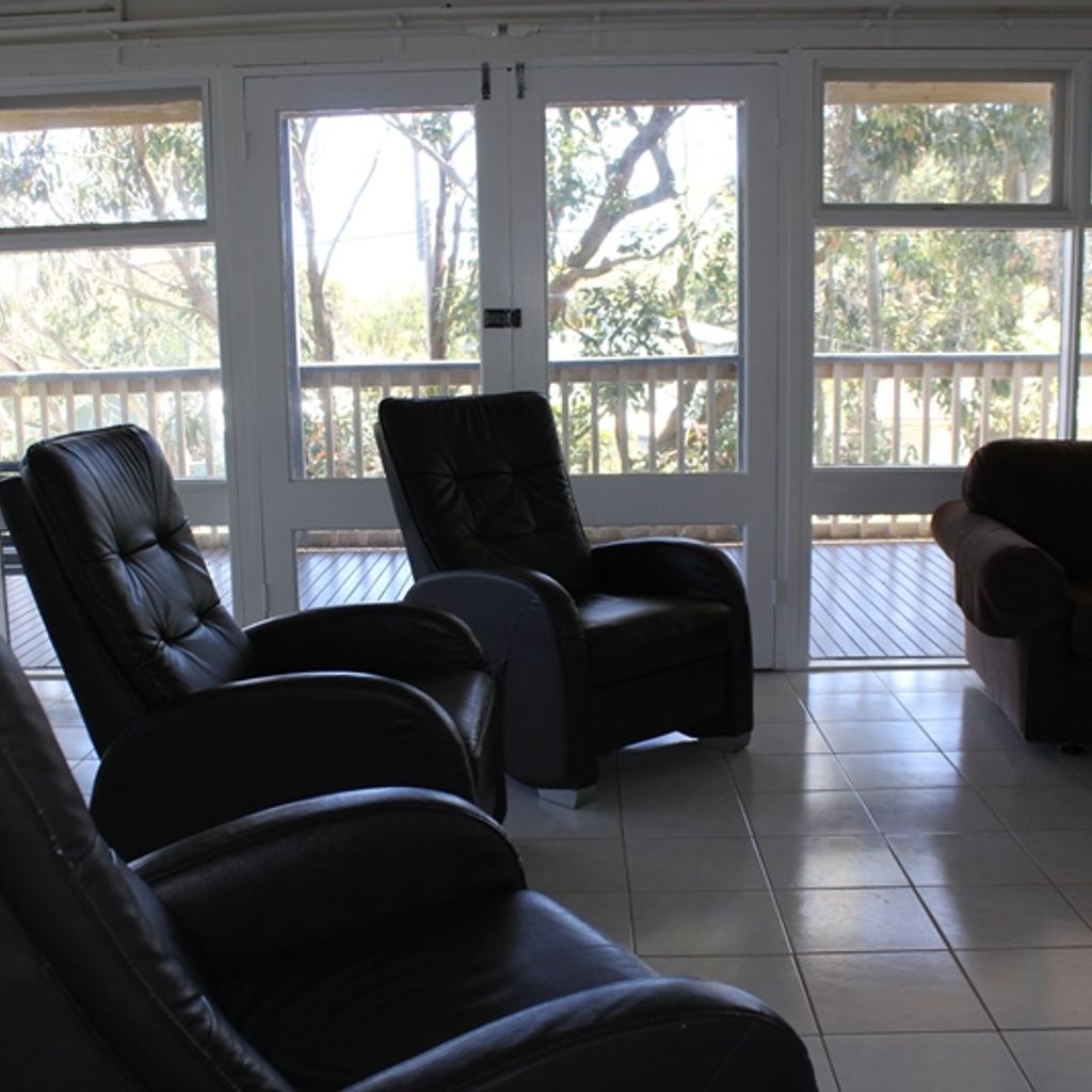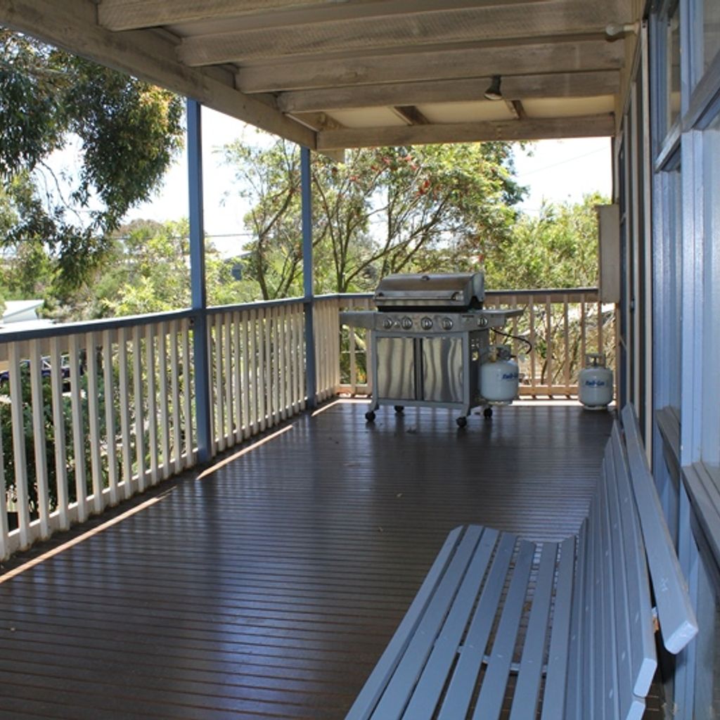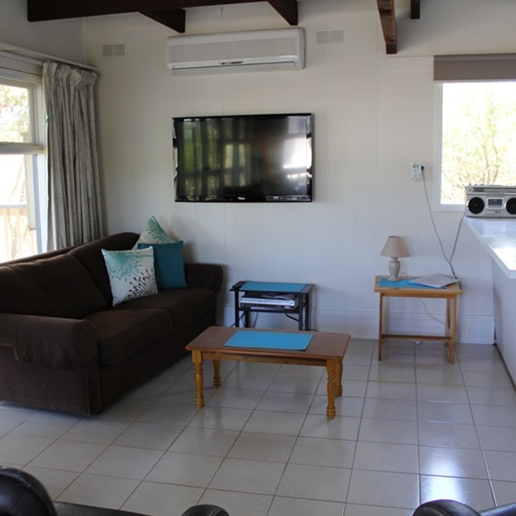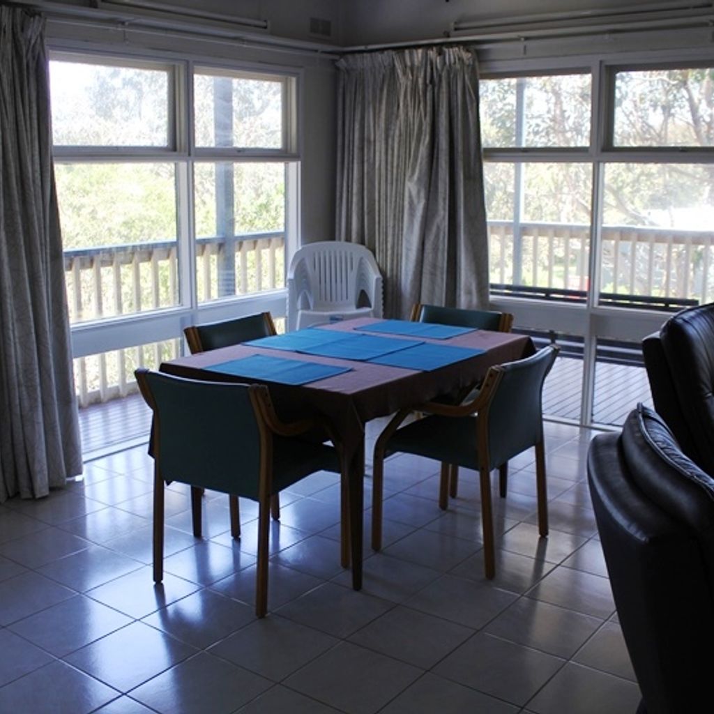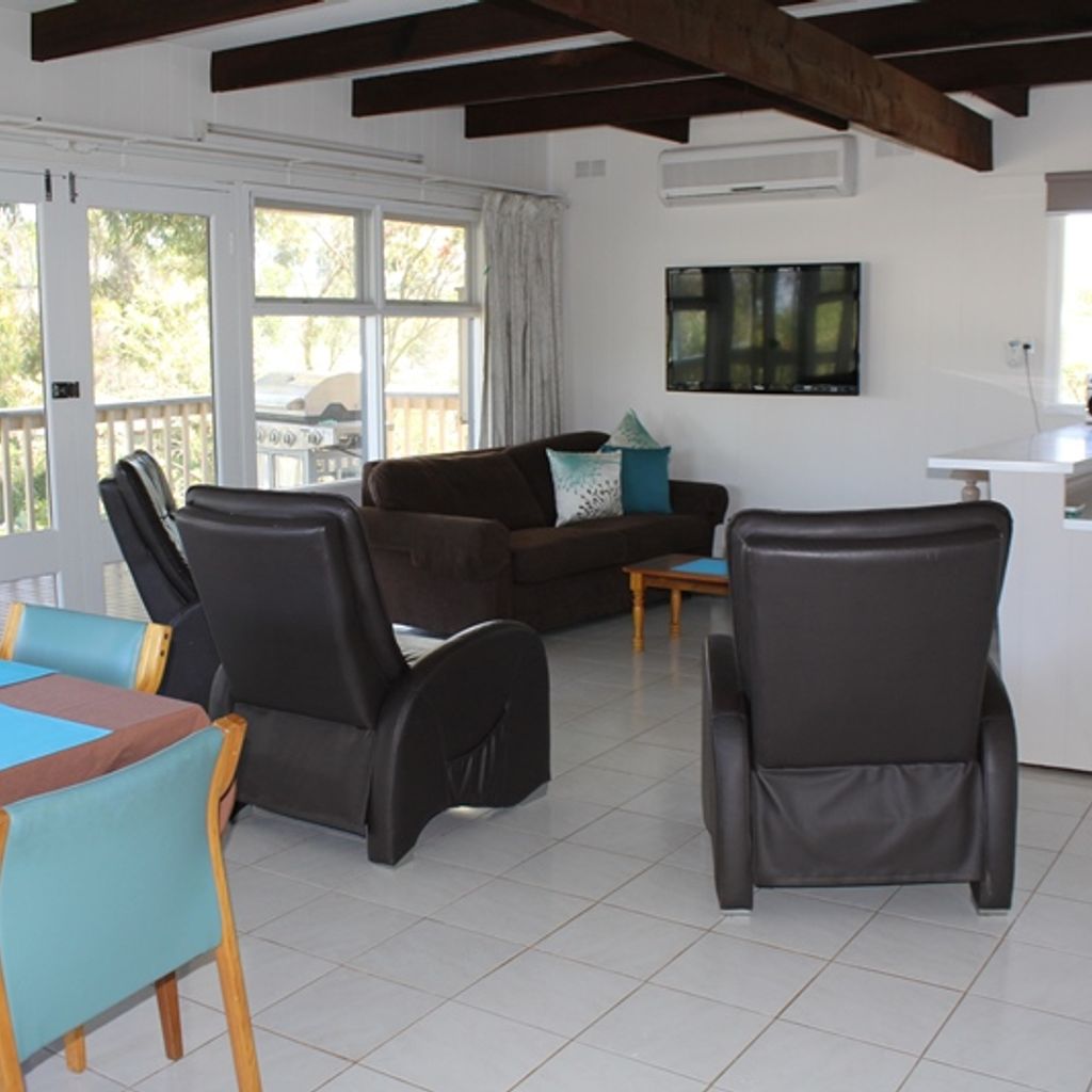 Upstairs is the main living area which is open plan, sunny and spacious with large windows looking out to the deck. There is a wall mounted flat screen tv and dvd player, a sofa and three leather recliners, split system heating and cooling, a central dining table and doors that open onto the large deck.