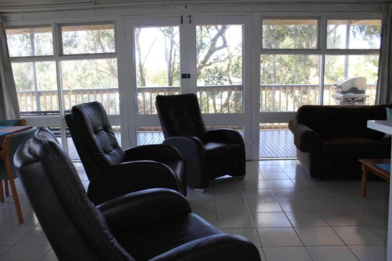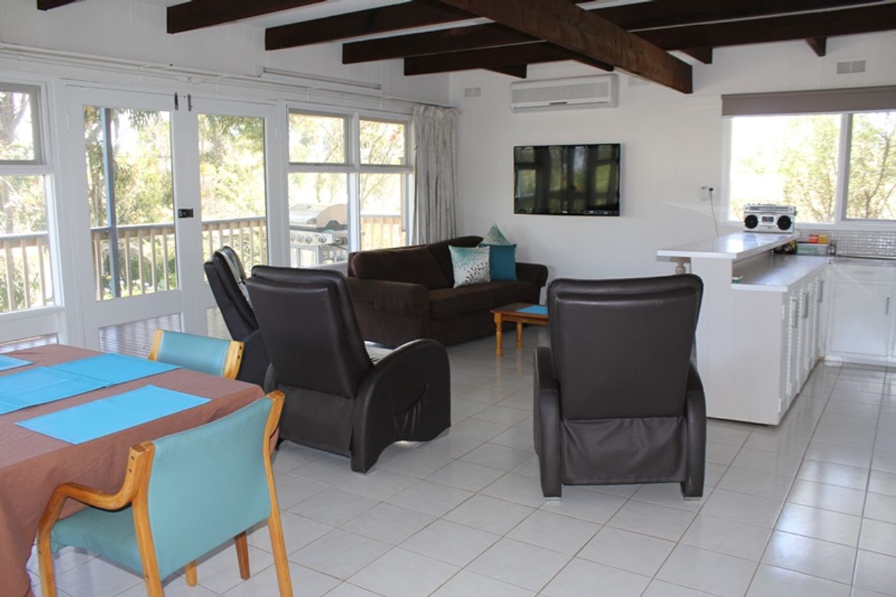 Upstairs is the main living area which is open plan, sunny and spacious with large windows looking out to the deck. There is a wall mounted flat screen tv and dvd player, a sofa and three leather recliners, split system heating and cooling, a central dining table and doors that open onto the large deck.