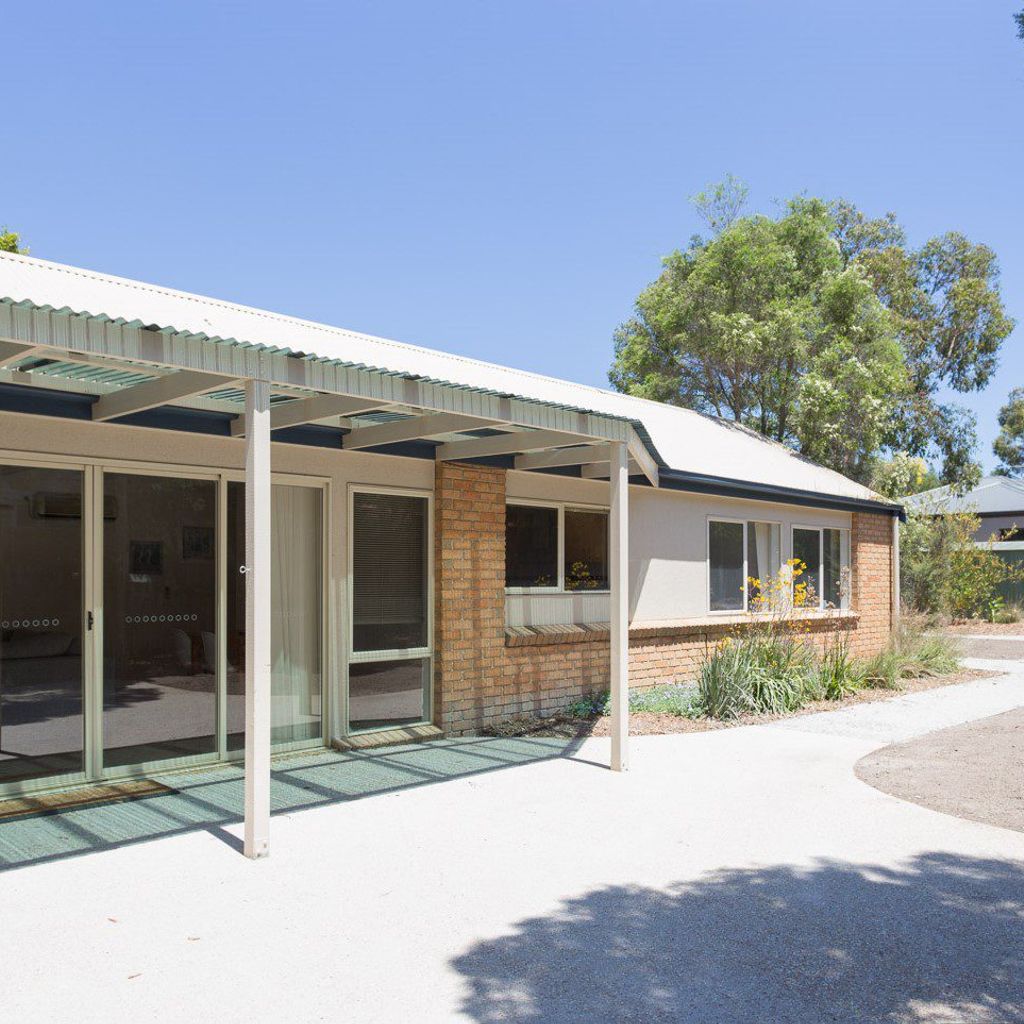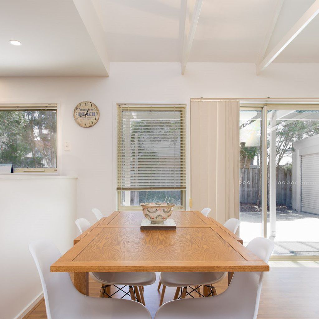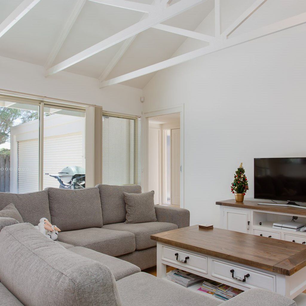 The beautifully designed open plan lounge/dining area, has vinyl flooring and lounge setting for 5-6 guests. This area is heated and cooled by a split system and ceiling fans. You will find plenty of magazines, so you can sit back and enjoy your stay. There is limited Wifi with Netflix and also a PlayStation provided to keep the children occupied, while the adults sit back and relax. The dining table is located behind the lounge area and has seating for 6. This area overlooks the beautifully landscaped backyard.