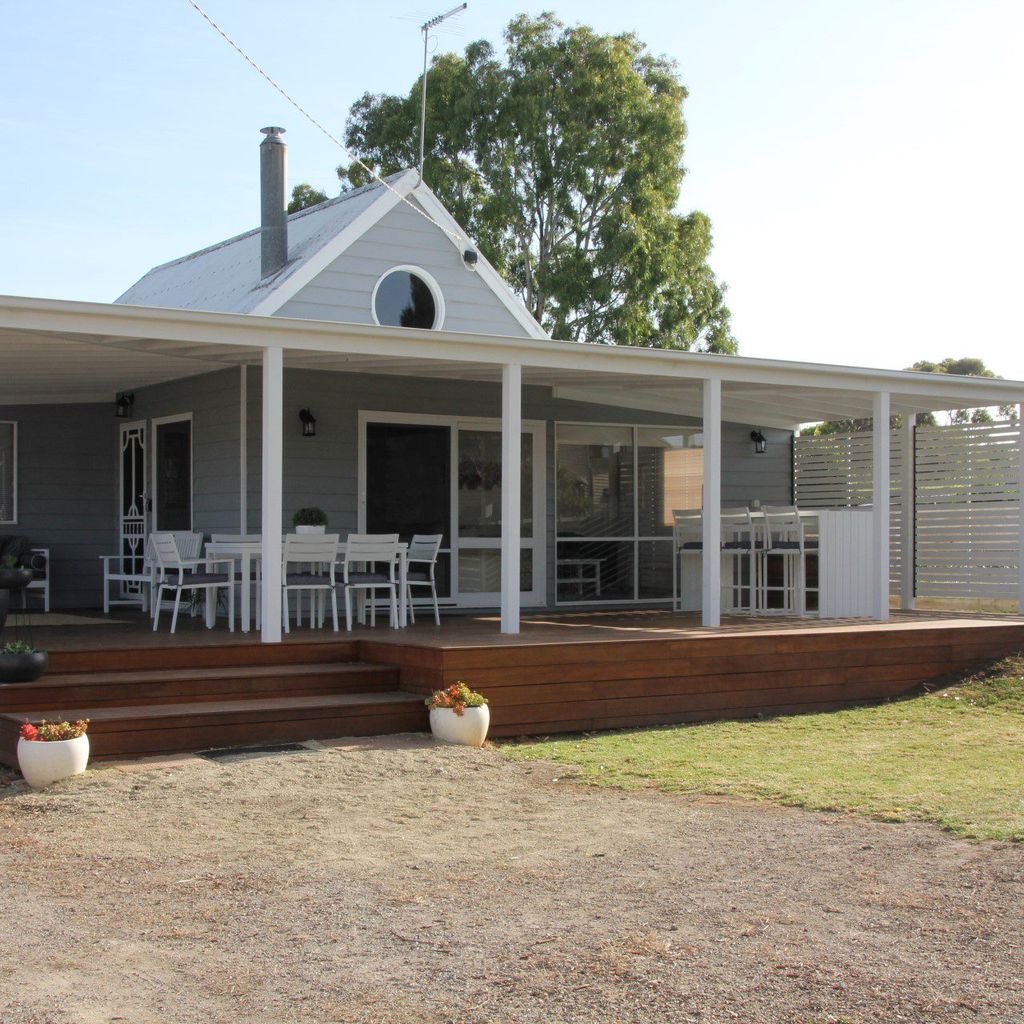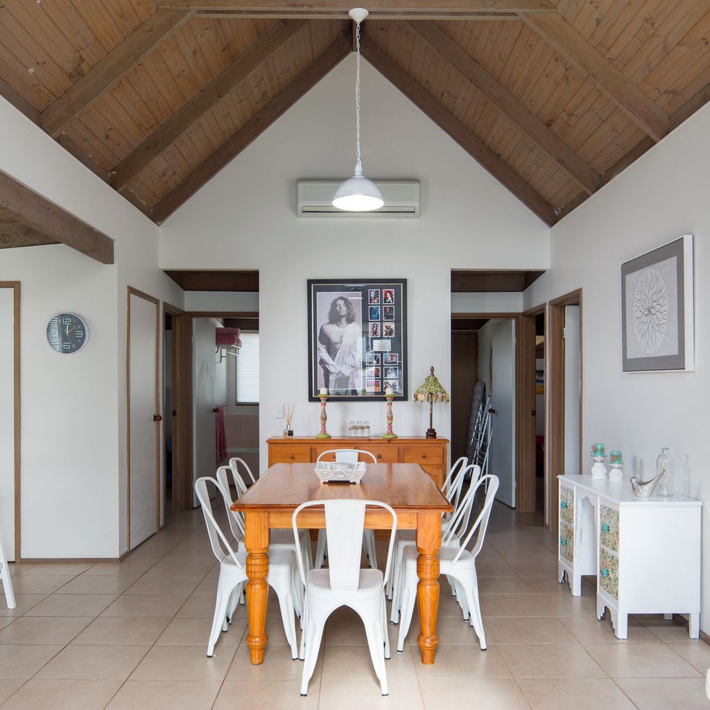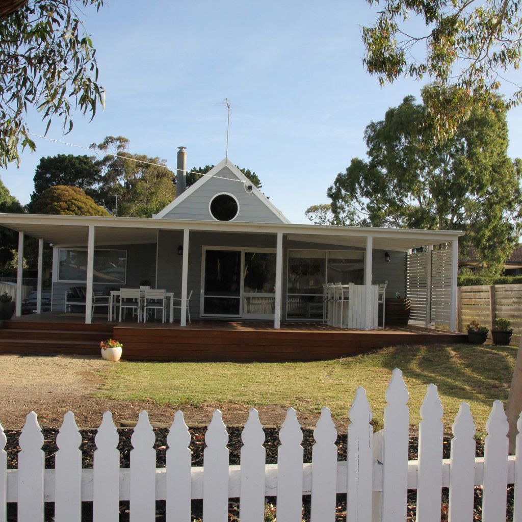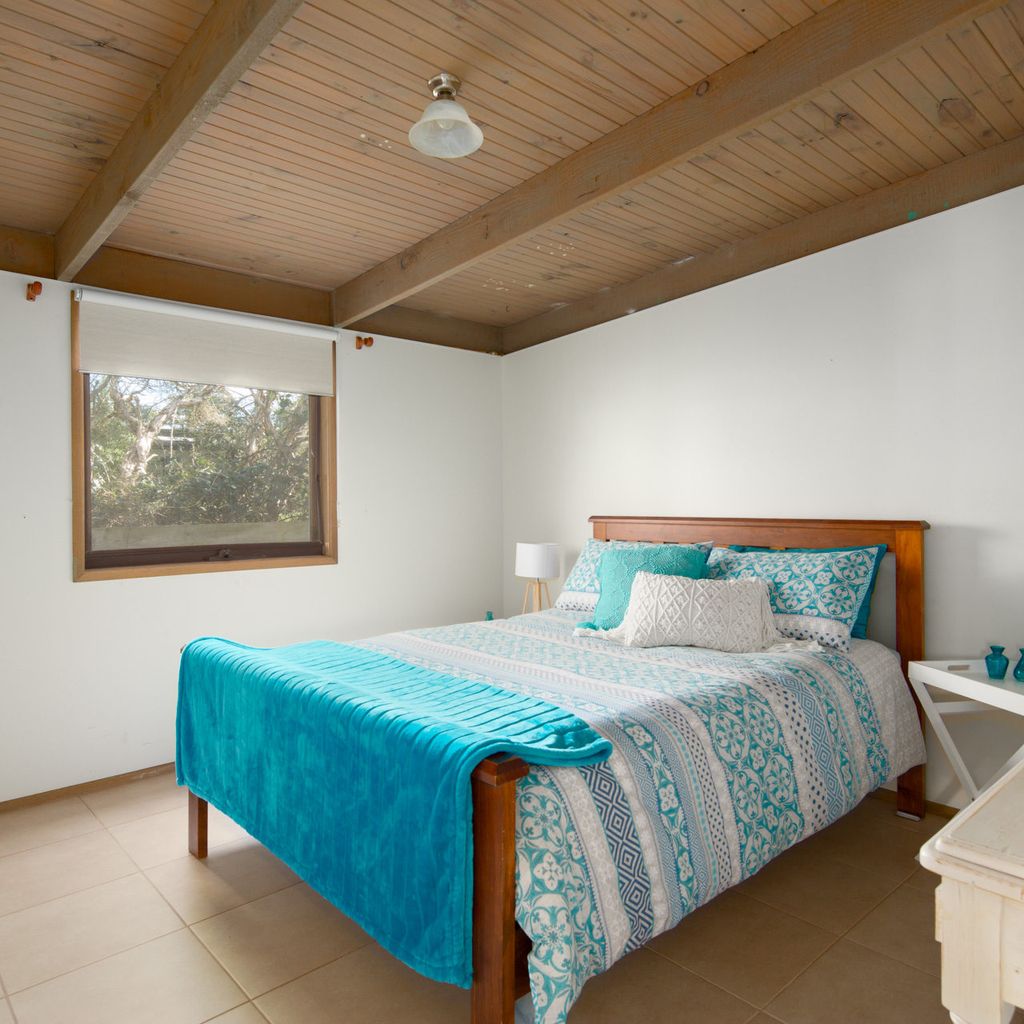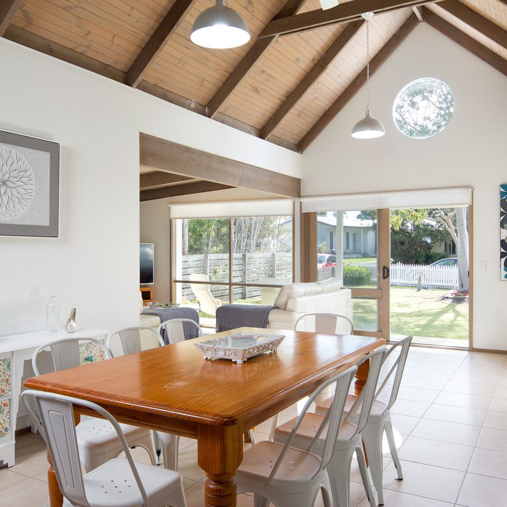 A unique and thoughtfully designed holiday home with timber ceilings throughout. Relax in the comfy lounge room whilst watching a movie or enjoy a book as the sun streams through the large windows. Open up the doors and you will walk out onto an expansive, covered deck with ample furniture to dine, have some drinks or just watch the kids play in the fenced yard.