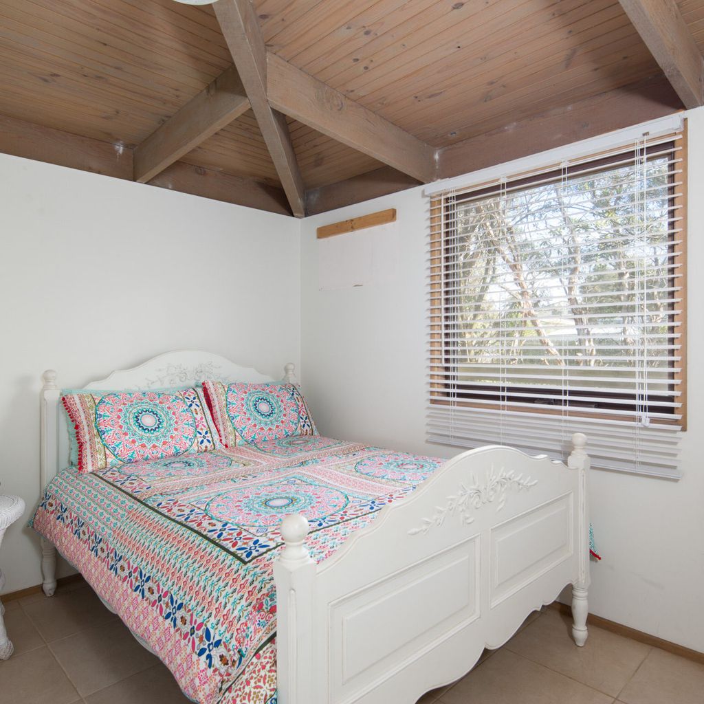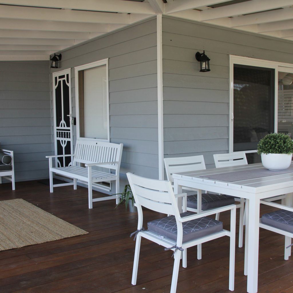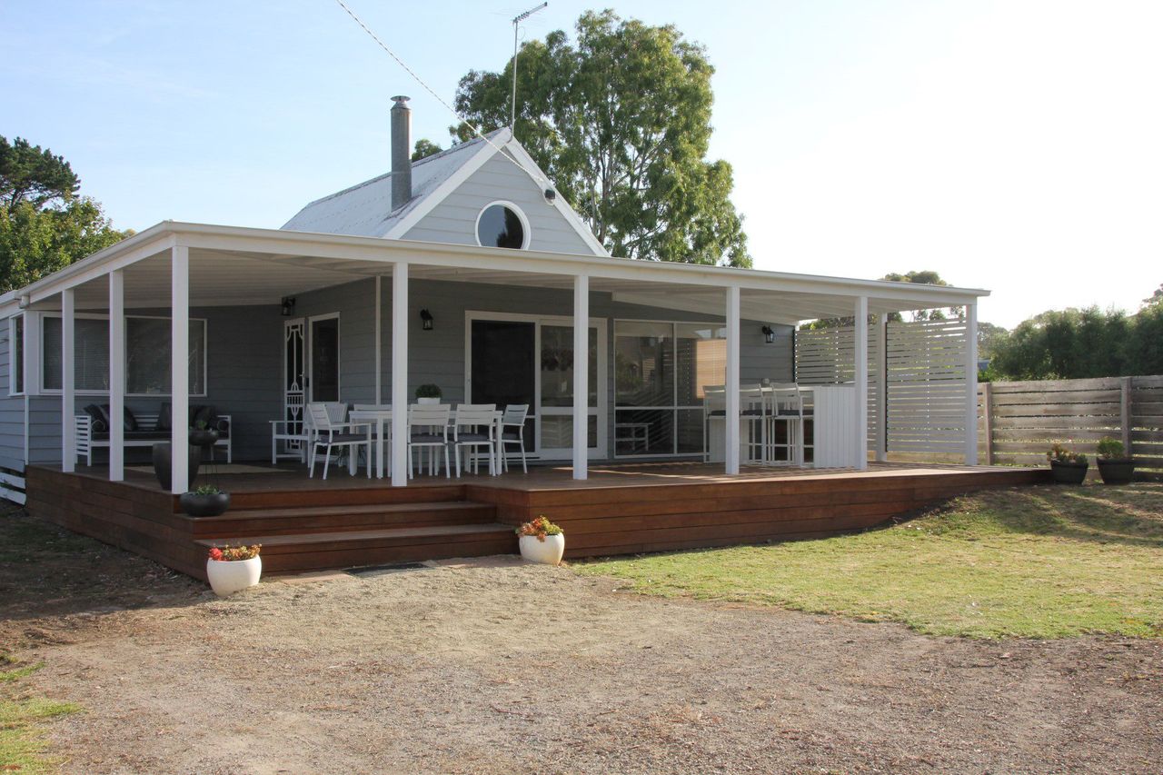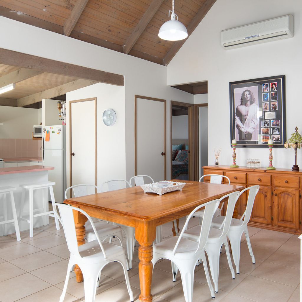 A unique and thoughtfully designed holiday home with timber ceilings throughout. Relax in the comfy lounge room whilst watching a movie or enjoy a book as the sun streams through the large windows. Open up the doors and you will walk out onto an expansive, covered deck with ample furniture to dine, have some drinks or just watch the kids play in the fenced yard.