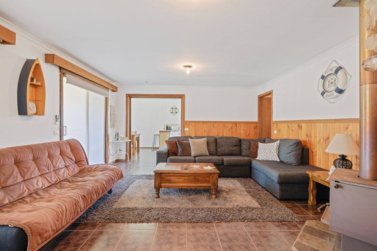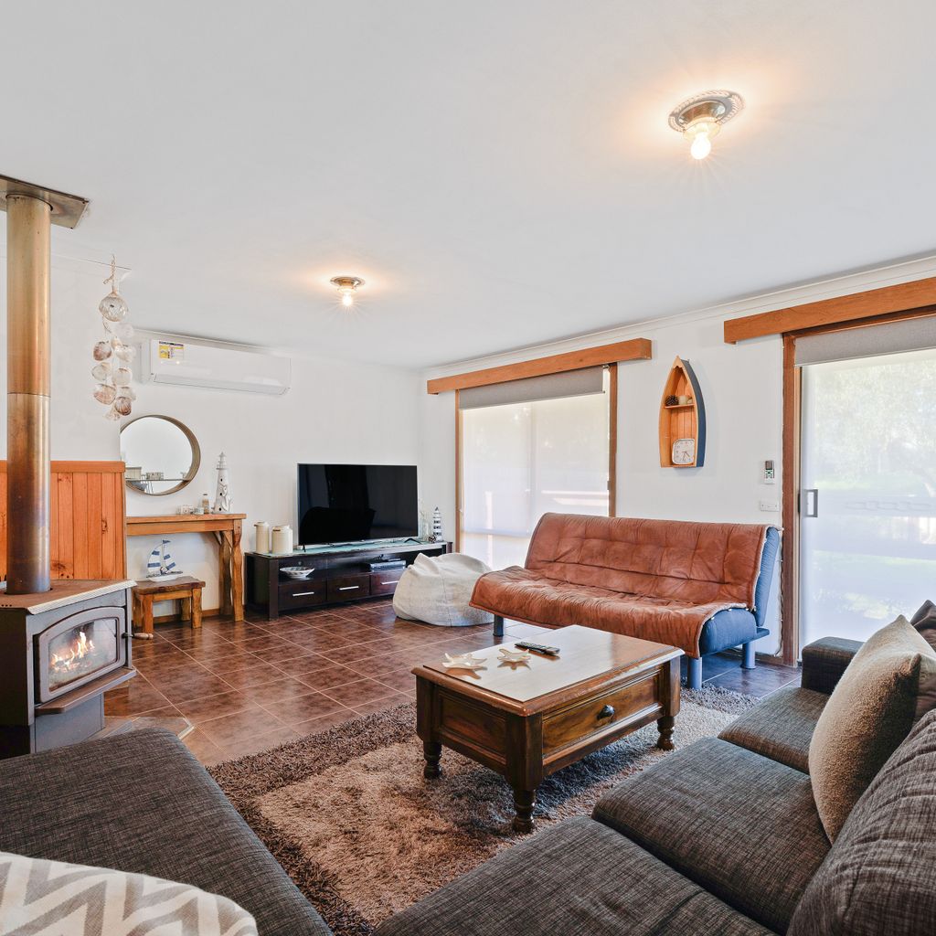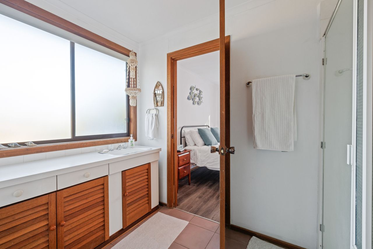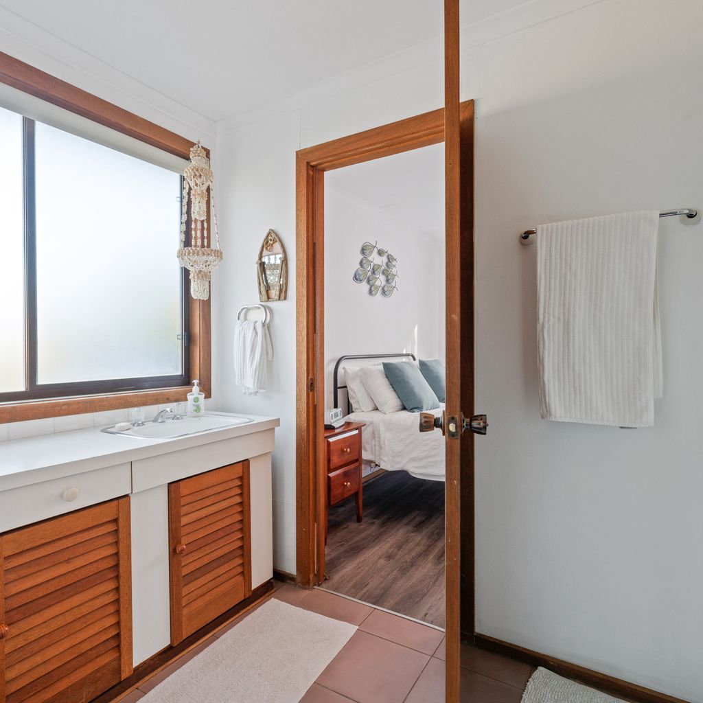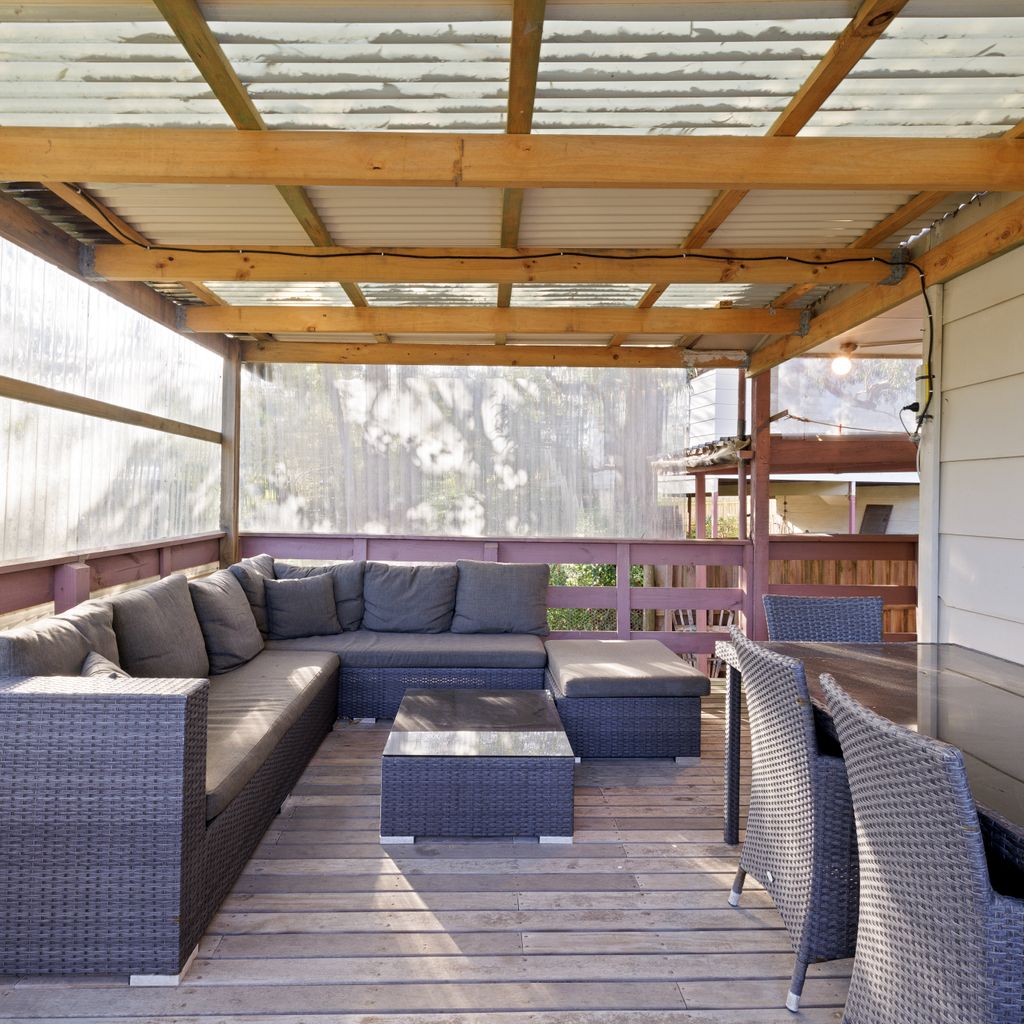 There is one bathroom connecting to the main bedroom with queen bed and hallway. 2 bedrooms have a double and single bed in each. The laundry has washing machine, iron and ironing board. The side of the house has a cool verandah with loads of seating, perfect for sitting out on a warm summer evening.