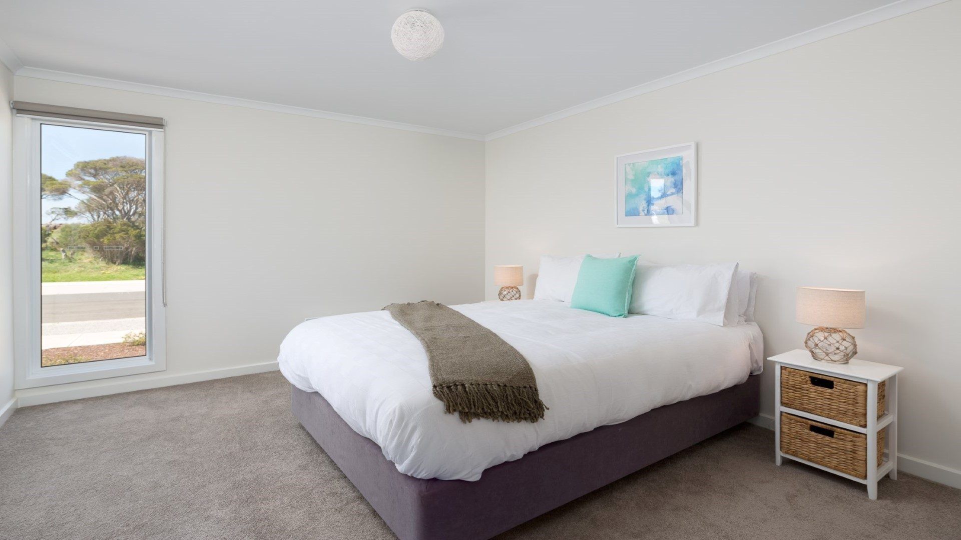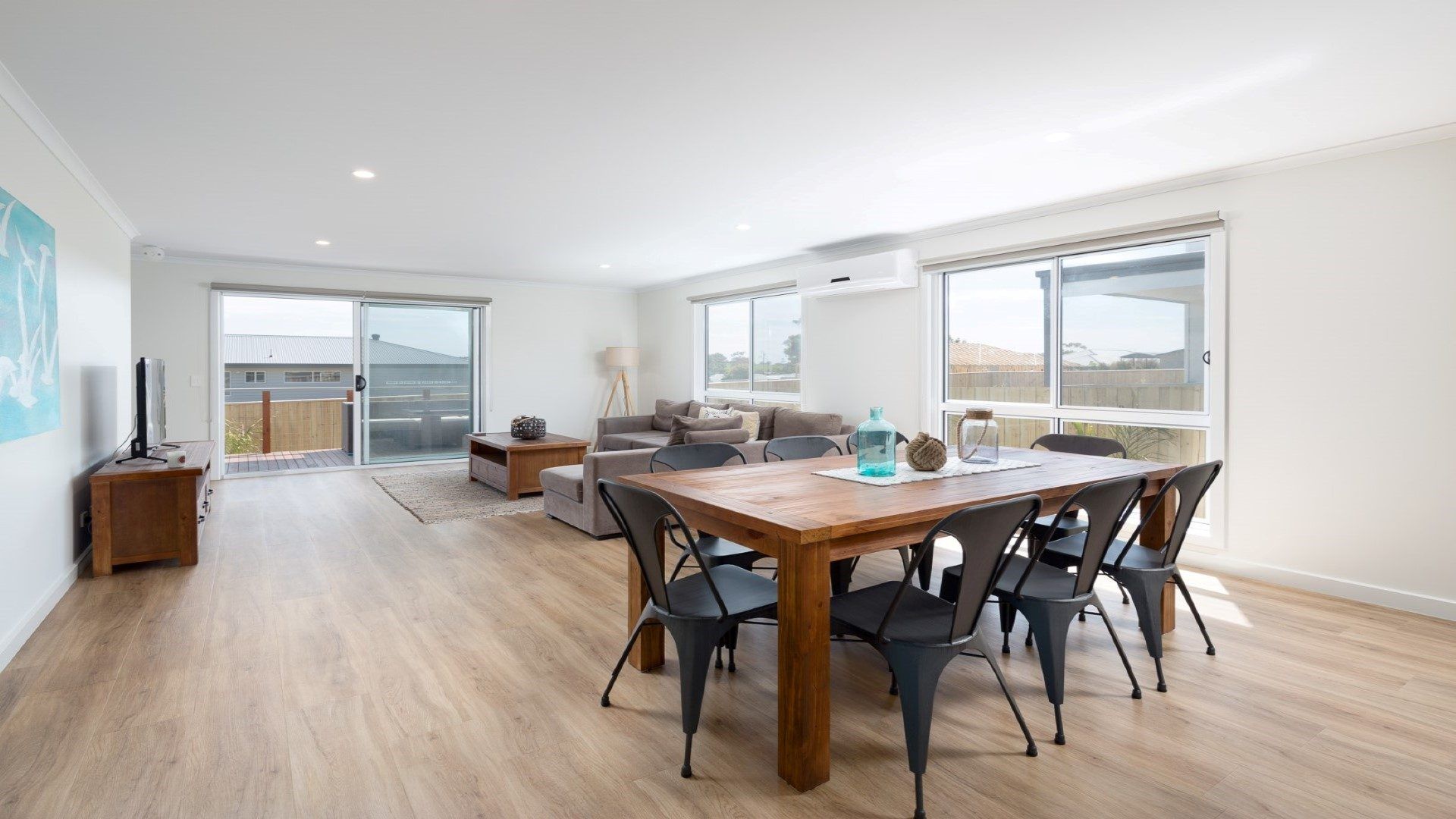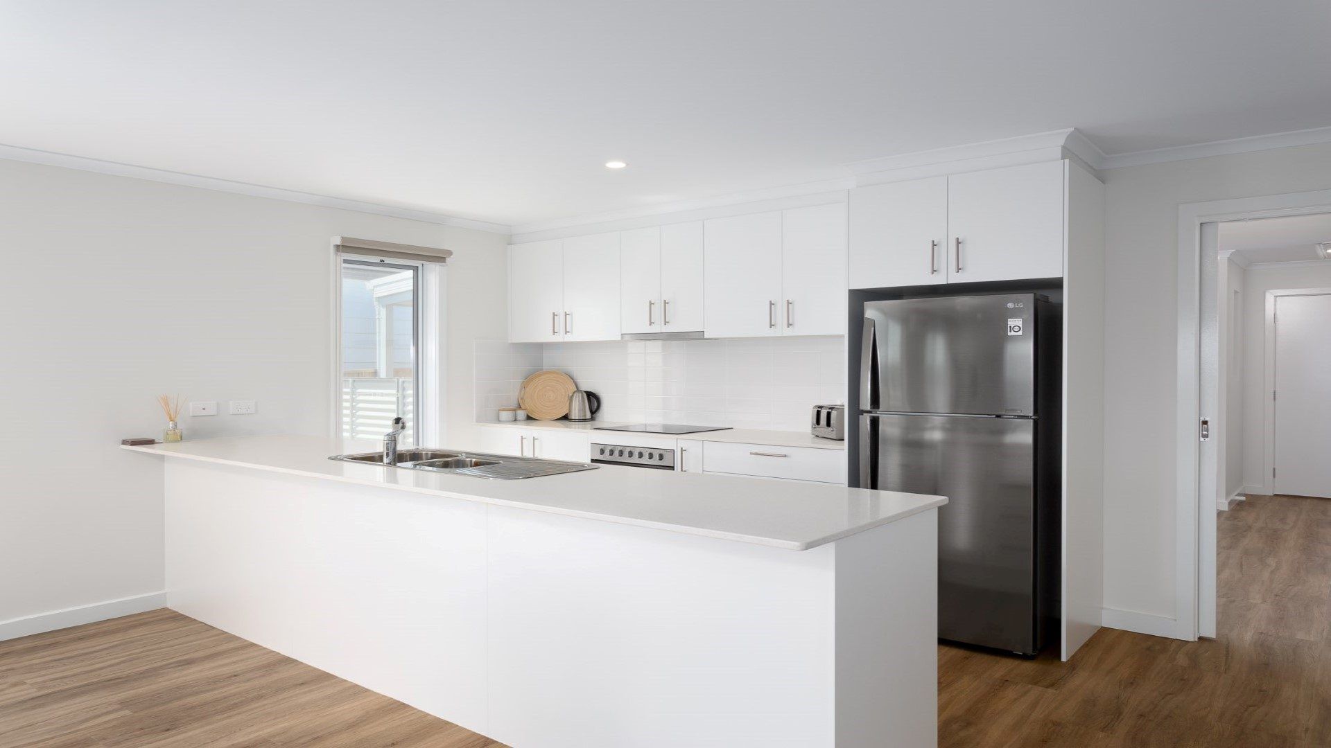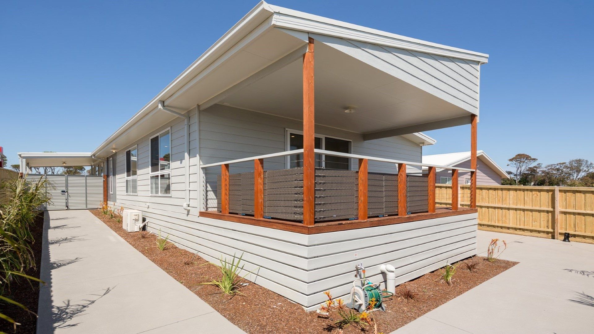The large open plan area has an L-shaped lounge to sprawl out on whilst watching the flat screen TV. Enjoy cooking a meal with family and friends using stainless steel electric appliances, large LG fridge and dishwasher. Sit around the dining table or move to the outside deck with a gorgeous wicker setting - perfect for a bbq lunch or dinner.