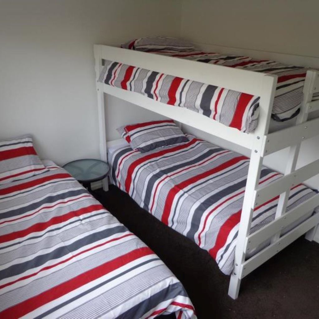 The Ground level offers another living area for the kids, xbox and Wii consoles, and Flat Screen tv. Also a second bedroom with a queens size bed, a third bedroom with a double size bunk bed and a trundle single mattress is available, a fourth bedroom with a king single bunk bed and a king single bed, and another bathroom with a large shower. Access to the laundry and double lockup garage with Table Tennis and Surfboard Storage Racks.