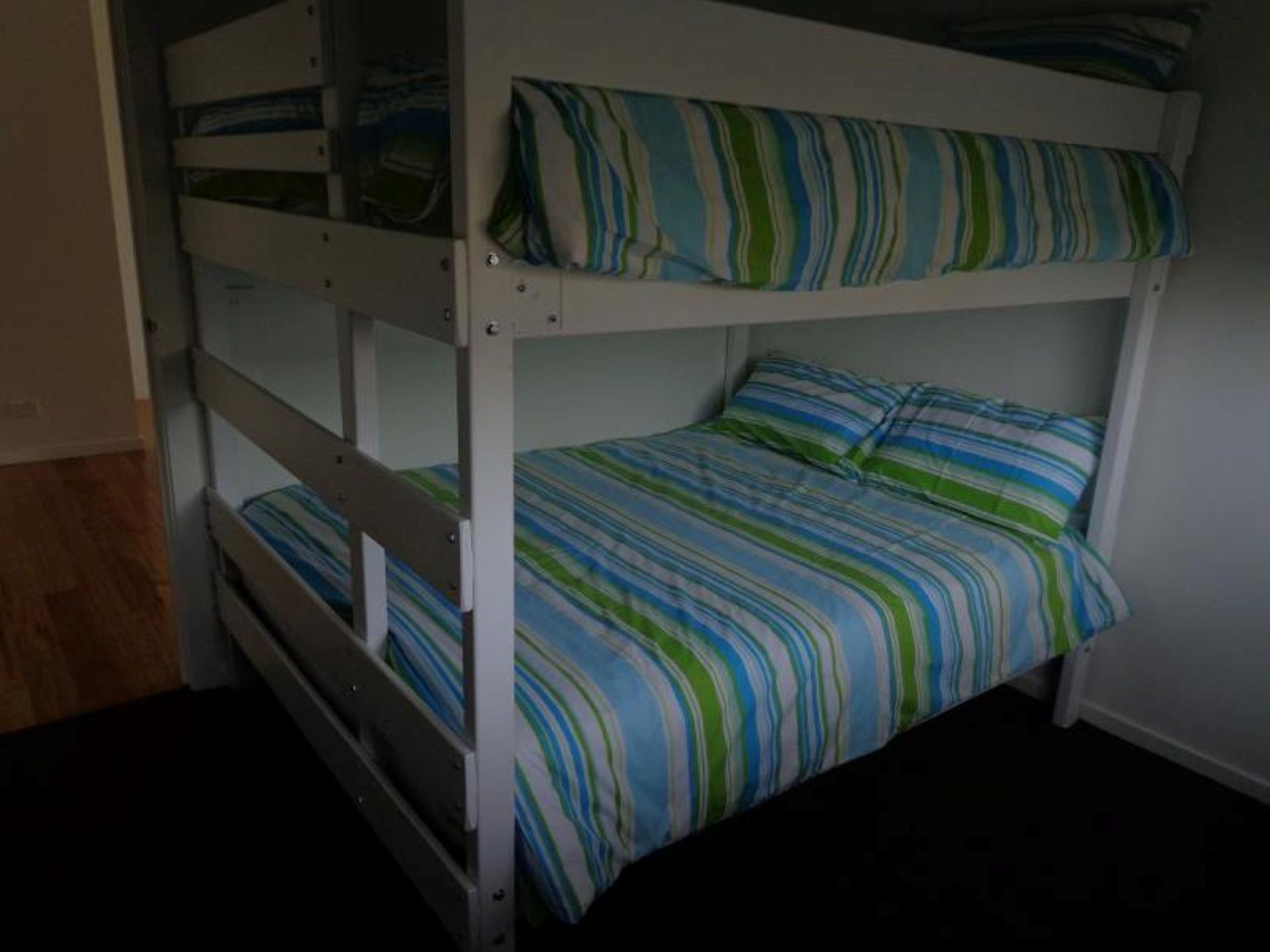 The Ground level offers another living area for the kids, xbox and Wii consoles, and Flat Screen tv. Also a second bedroom with a queens size bed, a third bedroom with a double size bunk bed and a trundle single mattress is available, a fourth bedroom with a king single bunk bed and a king single bed, and another bathroom with a large shower. Access to the laundry and double lockup garage with Table Tennis and Surfboard Storage Racks.
