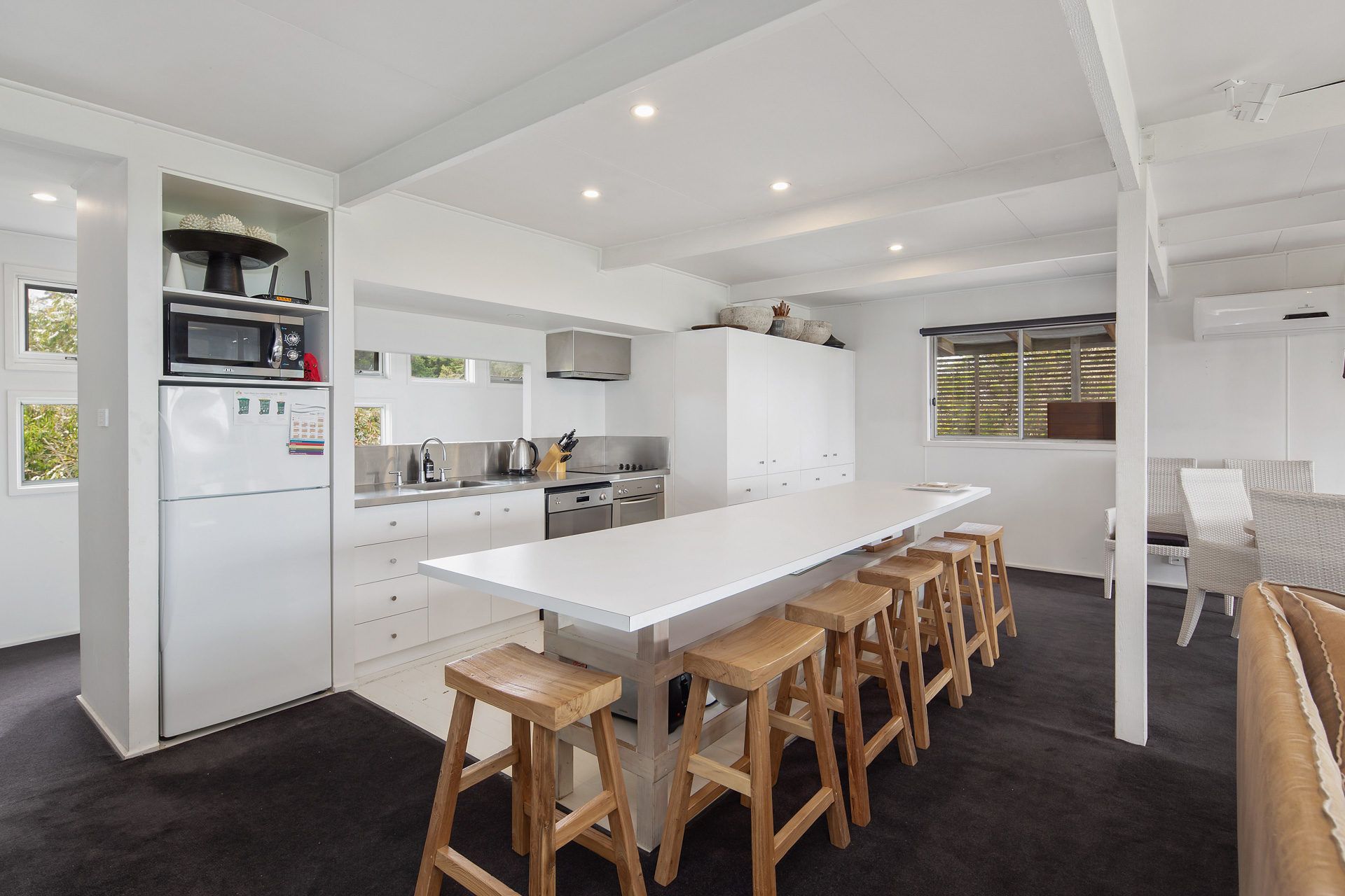 The kitchen has a giant island bench with 6 stools, coffee machine, dishwasher, electric cooking appliances and space to cater for the family holiday. The coffee machine is a KRUPS espresso machine please bring your own ground coffee.