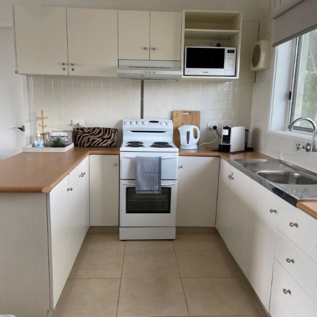The L-shaped lounge is new and very comfortable to relax in whilst watching the large flat screen tv or dvd. The unit has electric bar heater. Electric cooking appliances, microwave and even coffee pod machine, along with everything else needed is in the kitchen, which has a breakfast bar with 3 stools.