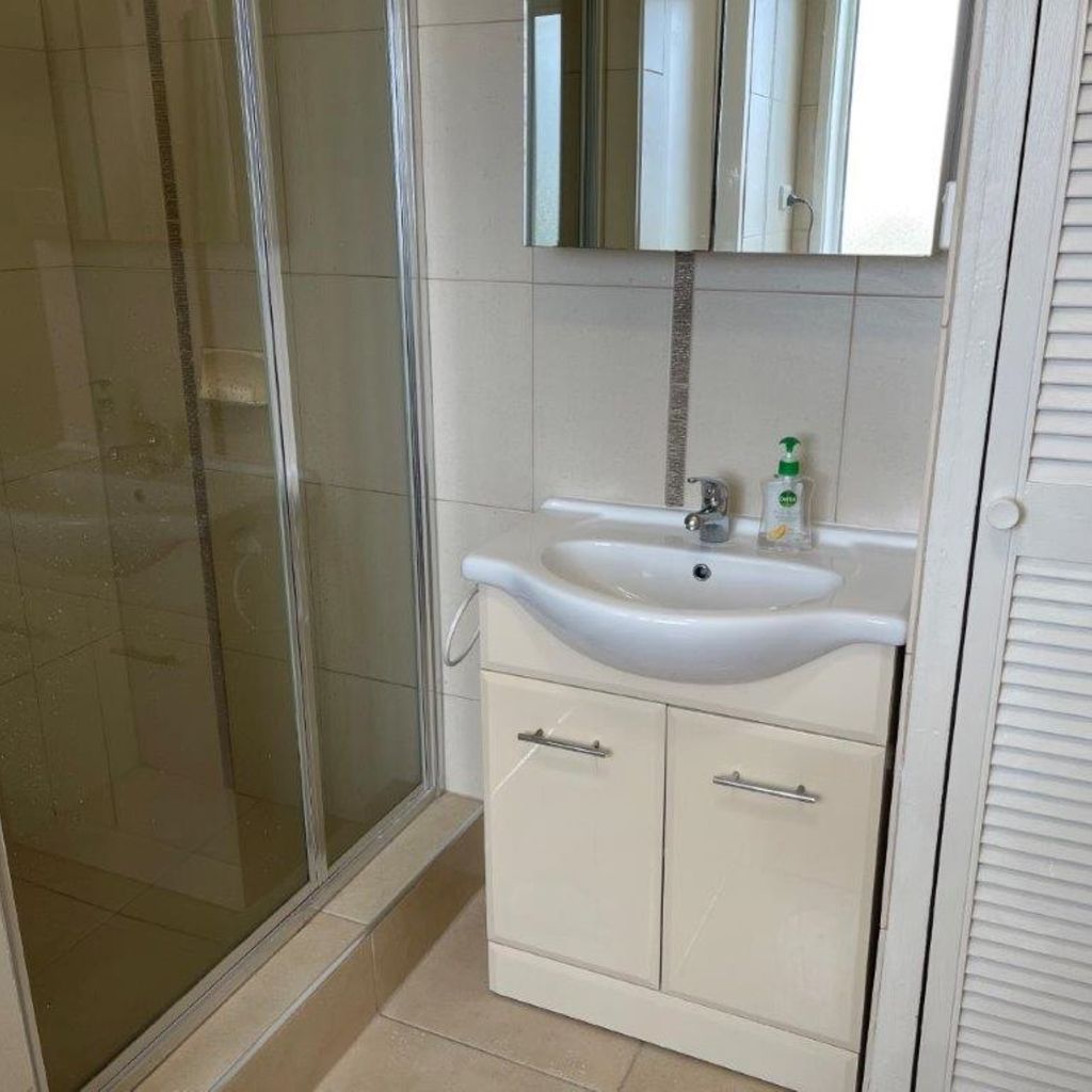 The bathroom and laundry are combined and include a shower, basin, toilet and washing machine.