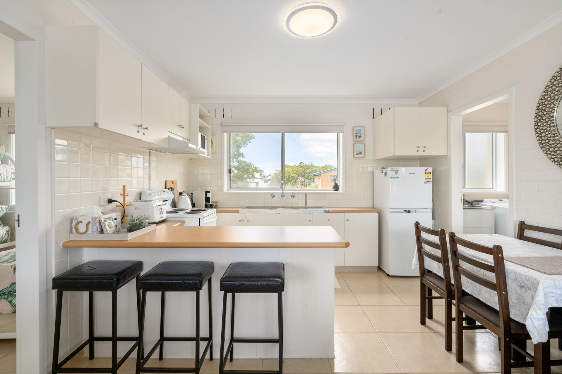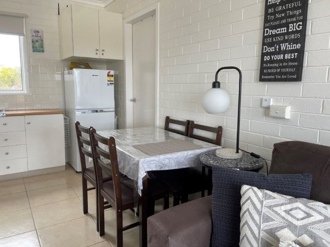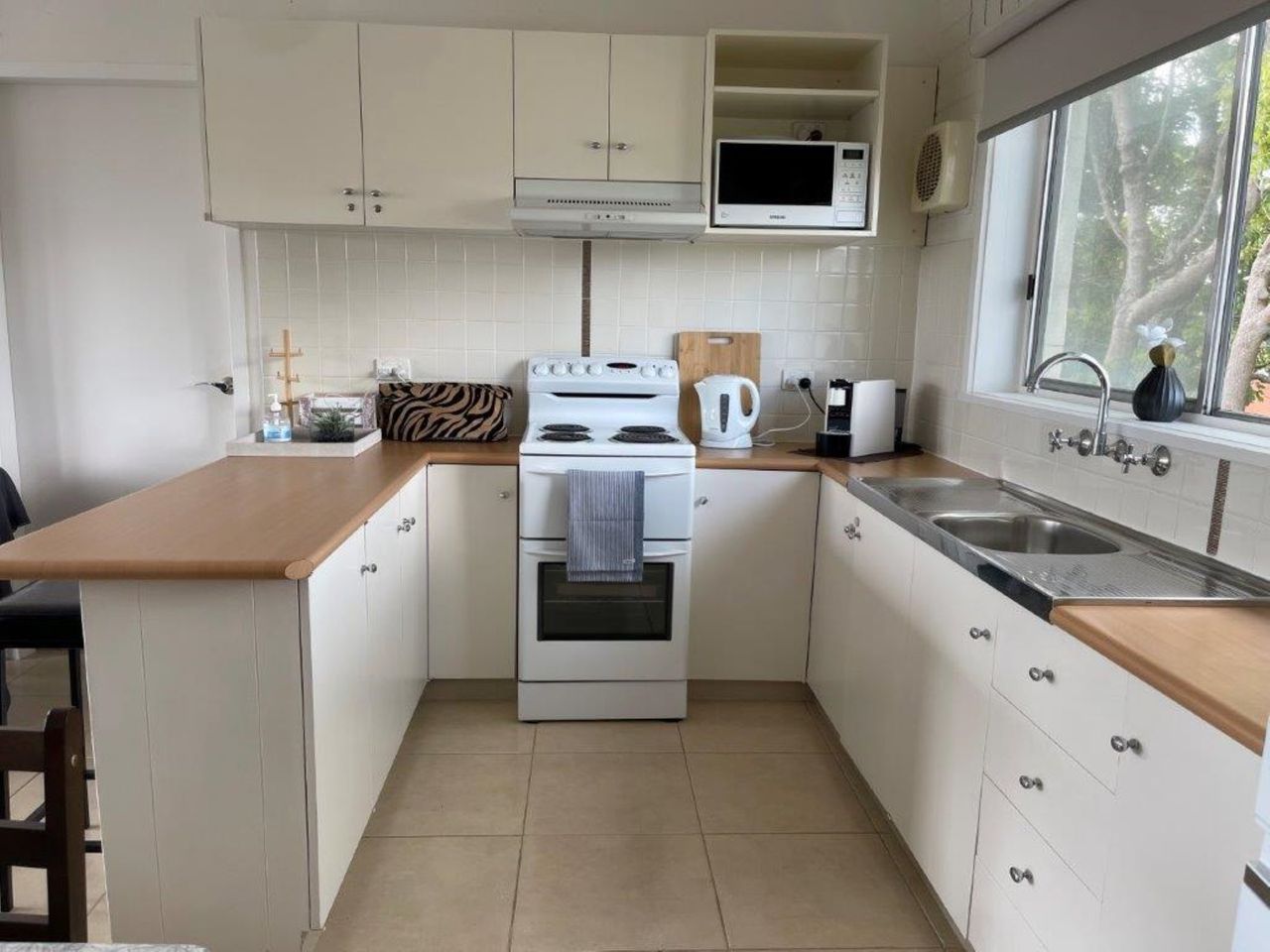 The L-shaped lounge is new and very comfortable to relax in whilst watching the large flat screen tv or dvd. The unit has electric bar heater. Electric cooking appliances, microwave and even coffee pod machine, along with everything else needed is in the kitchen, which has a breakfast bar with 3 stools.