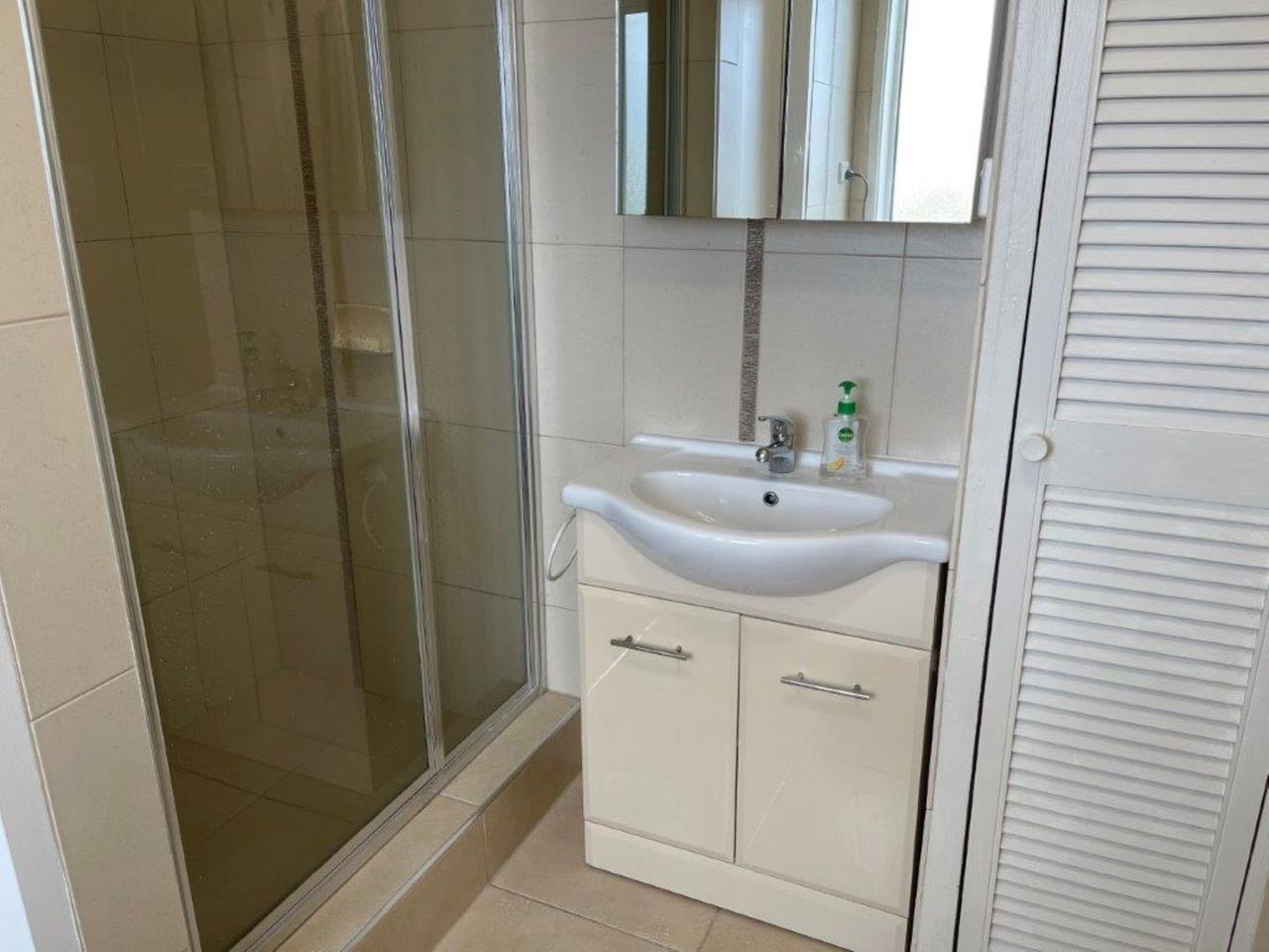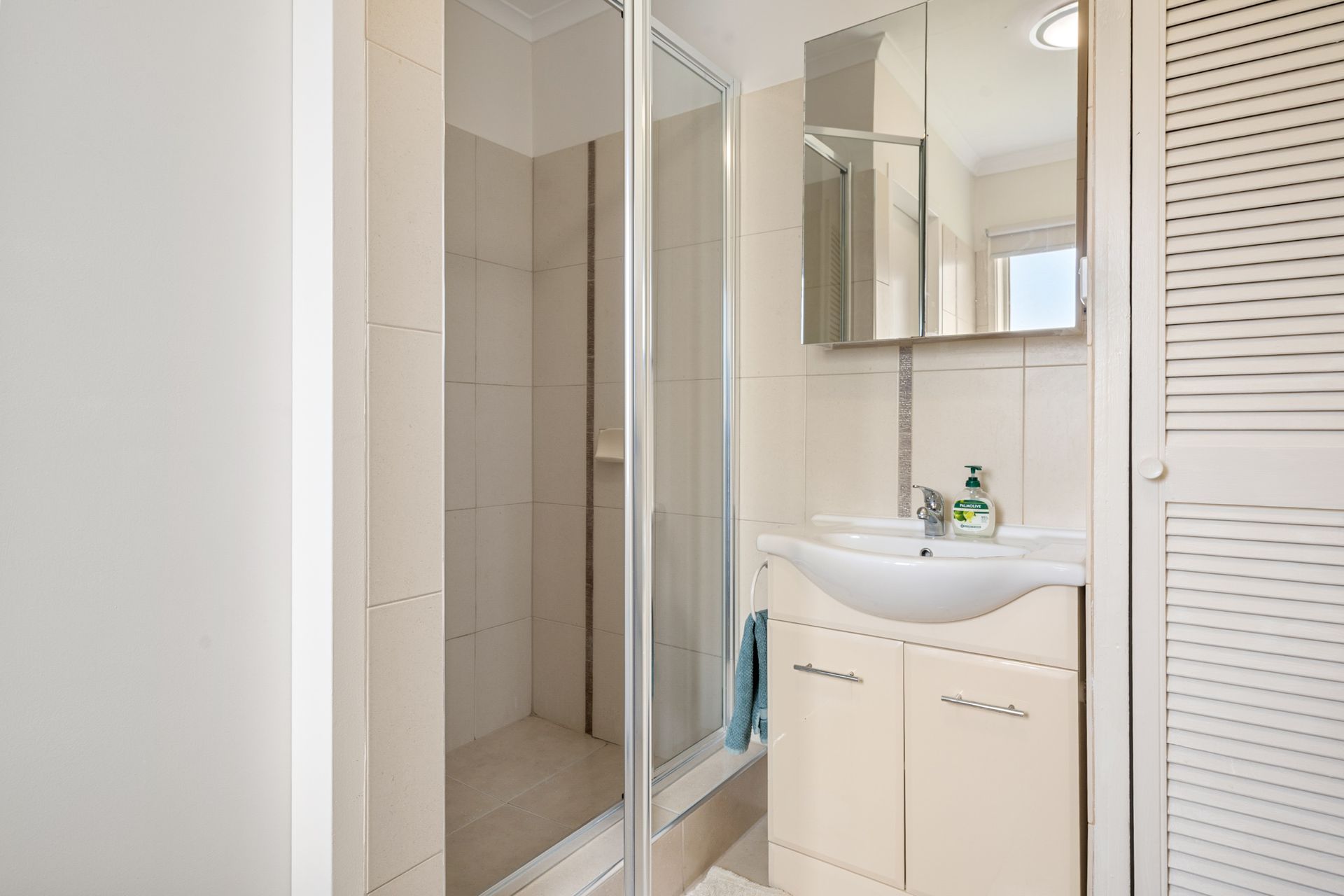 The bathroom and laundry are combined and include a shower, basin, toilet and washing machine.