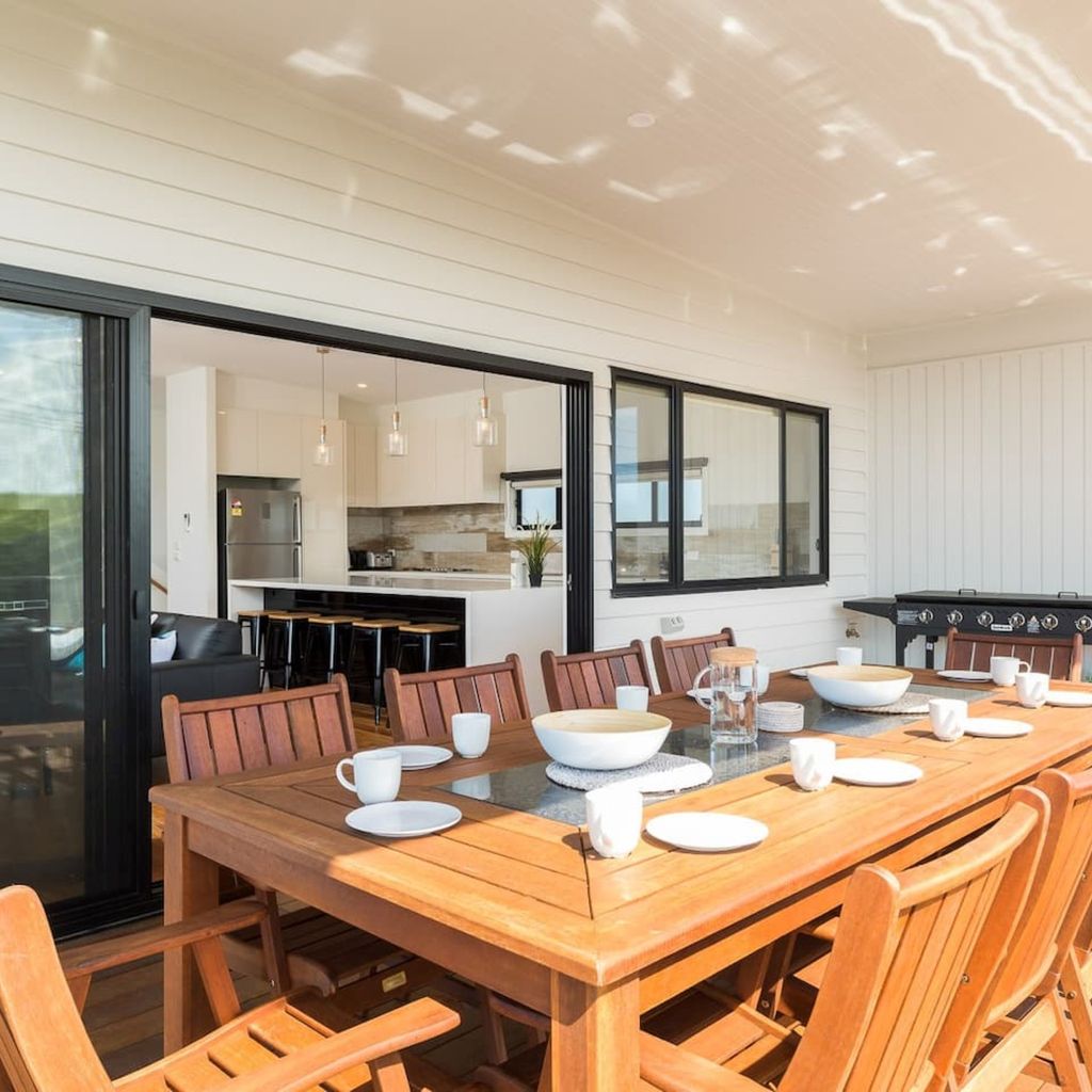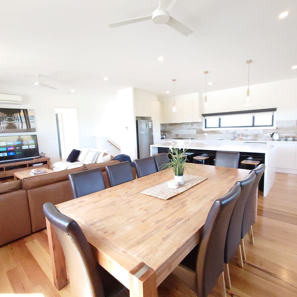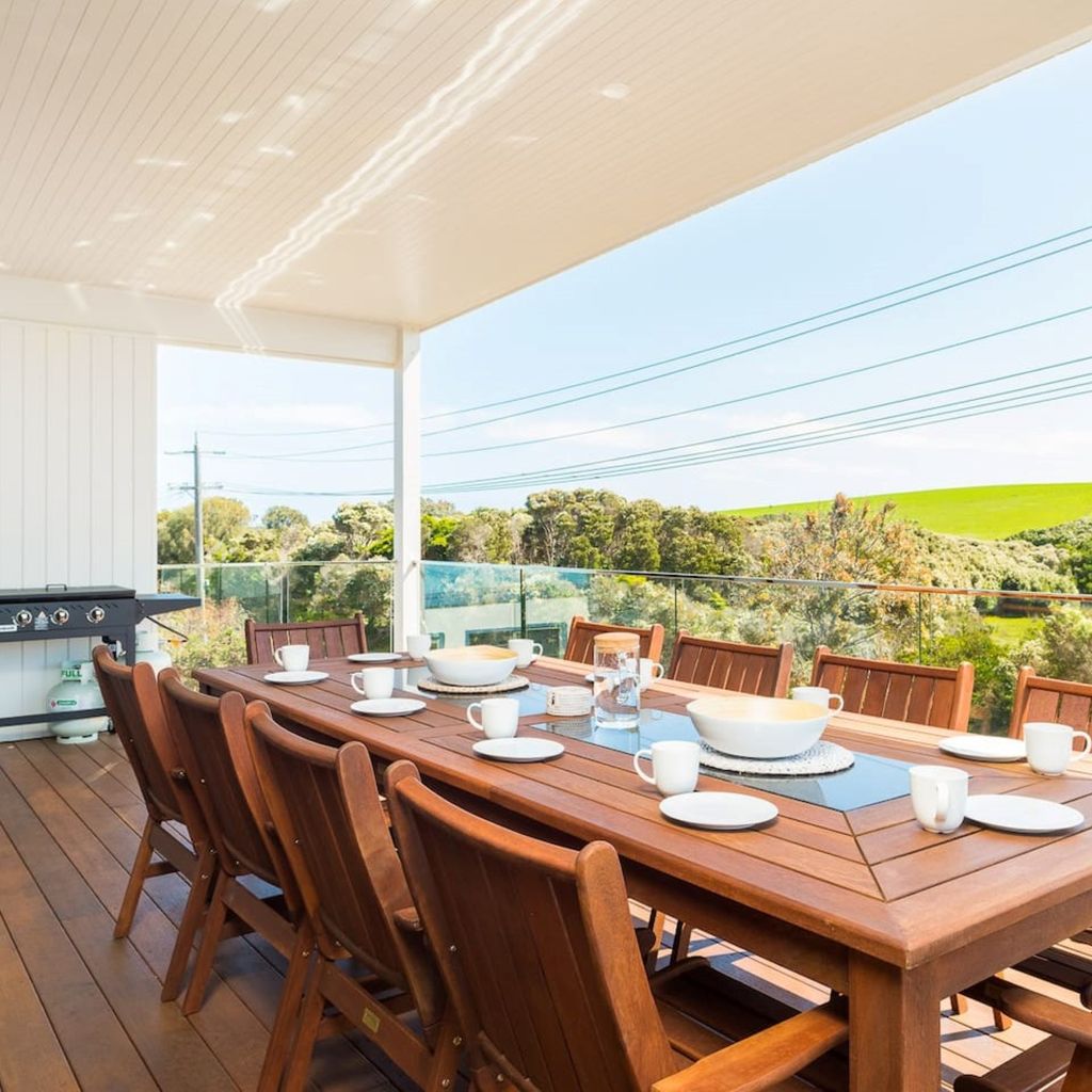Upstairs comprises the modern open plan kitchen, dining and living area, with large sliding doors opening onto the covered balcony. Enjoy the sunny open space with soft comfortable couches and large tv with sound bar, including Bluetooth, and a Chromecast with Google tv. The balcony faces west for the afternoon sun, overlooking reserve parkland and the hills of farm paddocks frequented by kangaroos. On the balcony there is also a BBQ and outdoor table. The dining table seats 8 and the balcony table seats 8.