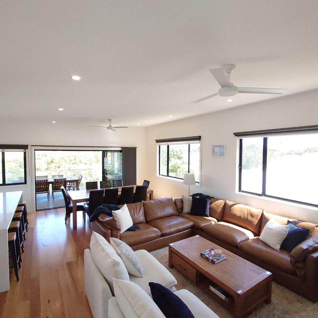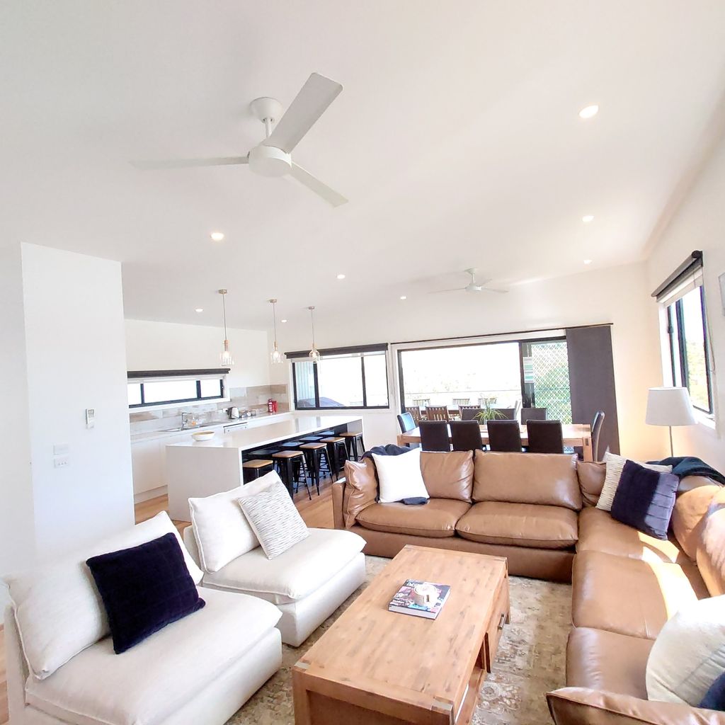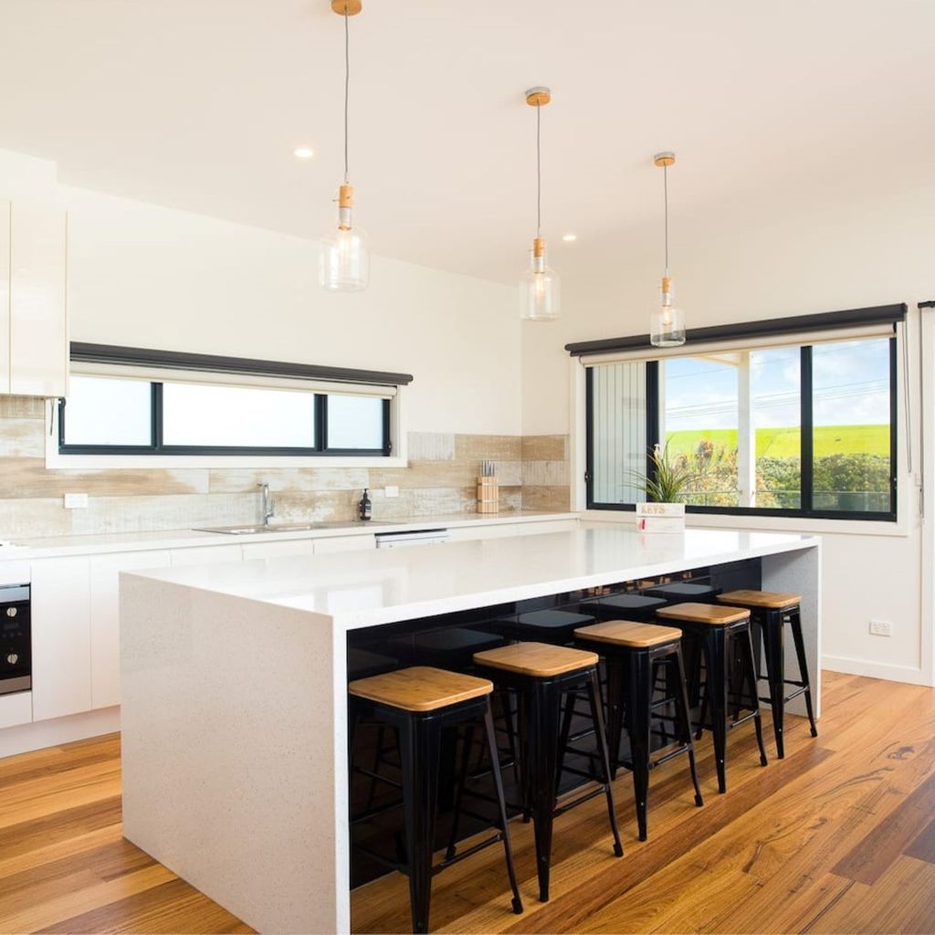 Upstairs comprises the modern open plan kitchen, dining and living area, with large sliding doors opening onto the covered balcony. Enjoy the sunny open space with soft comfortable couches and large tv with sound bar, including Bluetooth, and a Chromecast with Google tv. The balcony faces west for the afternoon sun, overlooking reserve parkland and the hills of farm paddocks frequented by kangaroos. On the balcony there is also a BBQ and outdoor table. The dining table seats 8 and the balcony table seats 8.