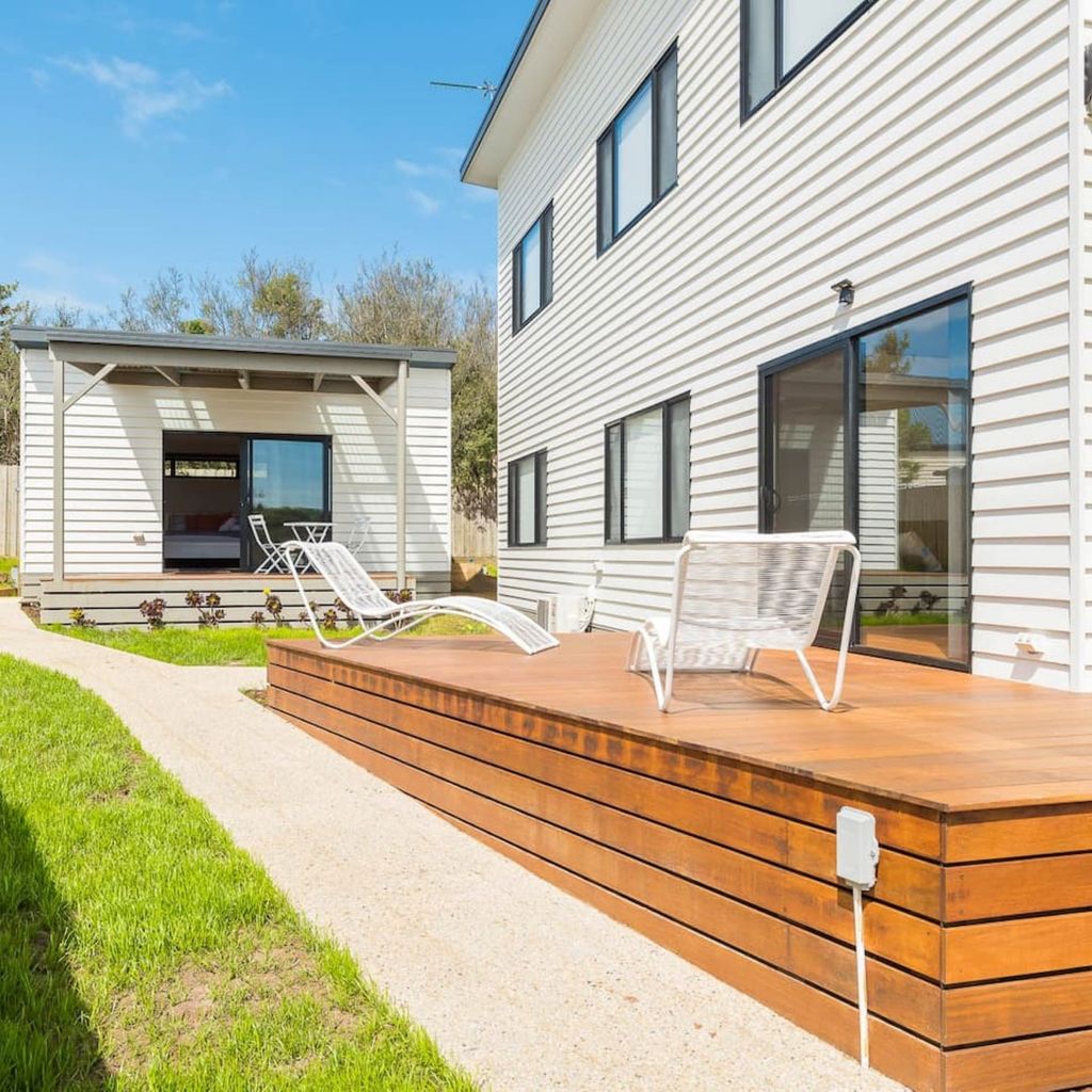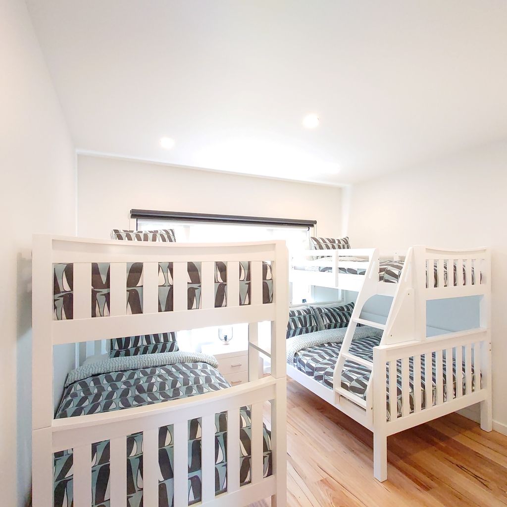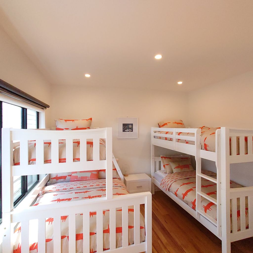 Set up for 2-3 families with one king master bedroom with ensuite, a queen bedroom as well as two bunk rooms for the kids with 2 bunk sets in each. (Please note the bunk weight capacity.) All rooms have built-in robes. Separate is a studio with a queen bed, kitchenette and bathroom.