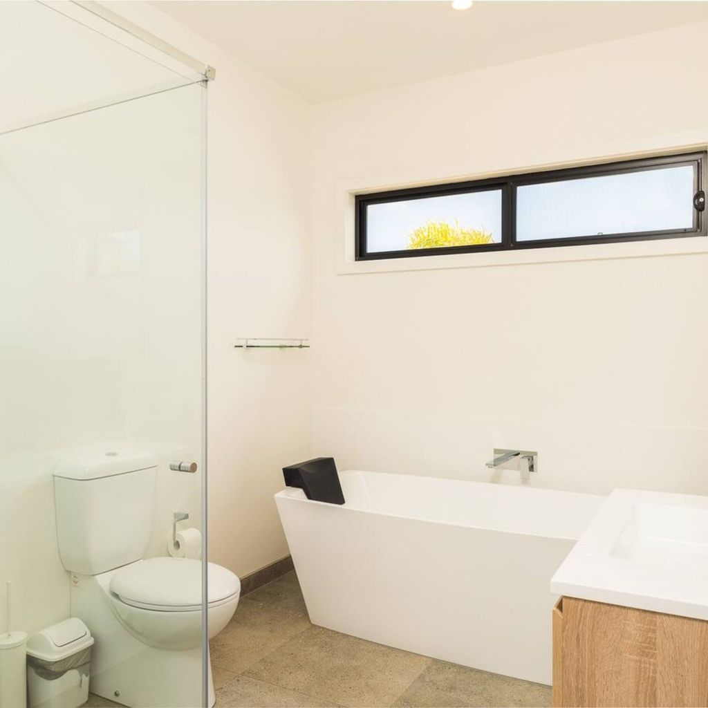 The master king bedroom has a large walk-in-wardrobe and an en-suite with a freestanding bath, shower & toilet.