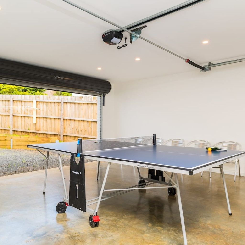 The garage is set up for fun, with a table tennis table, a TV with Chromecast with Google TV, a big Bluetooth speaker and more couches! On hot days the front and rear garage doors can be opened to let the breeze through. Parking is available in the driveway and outside the property.
