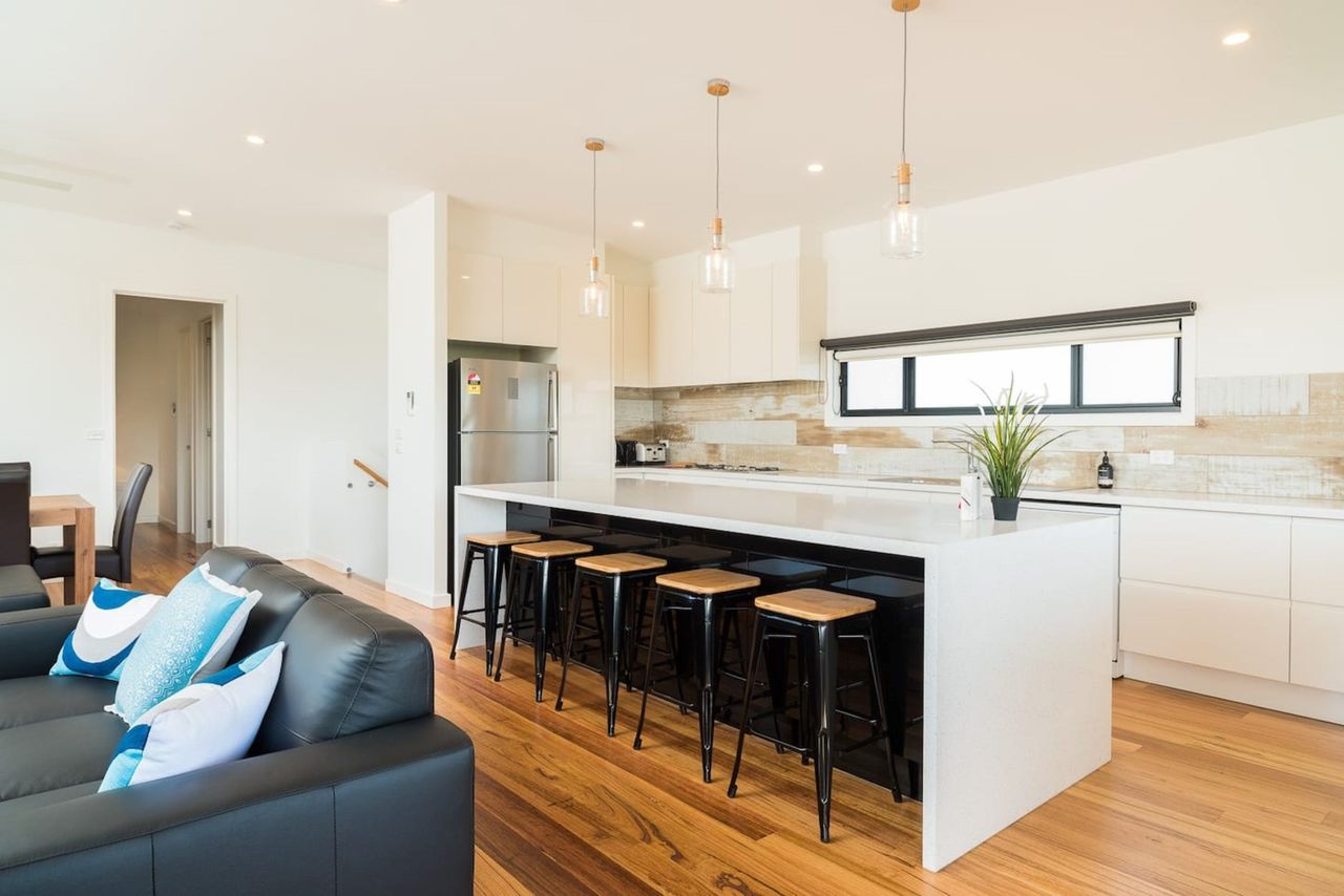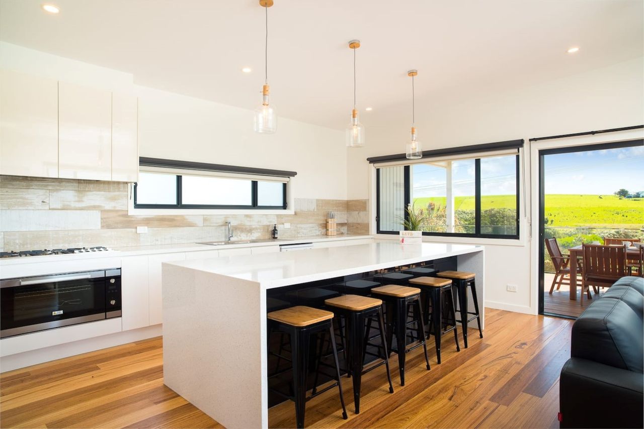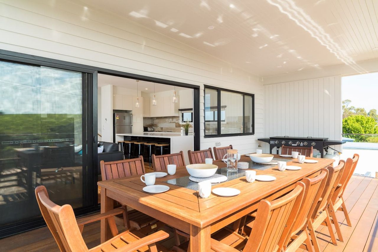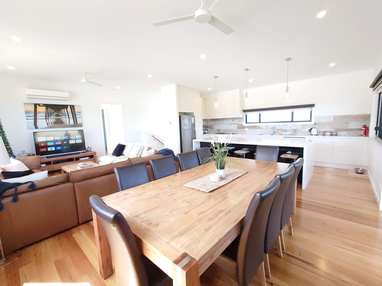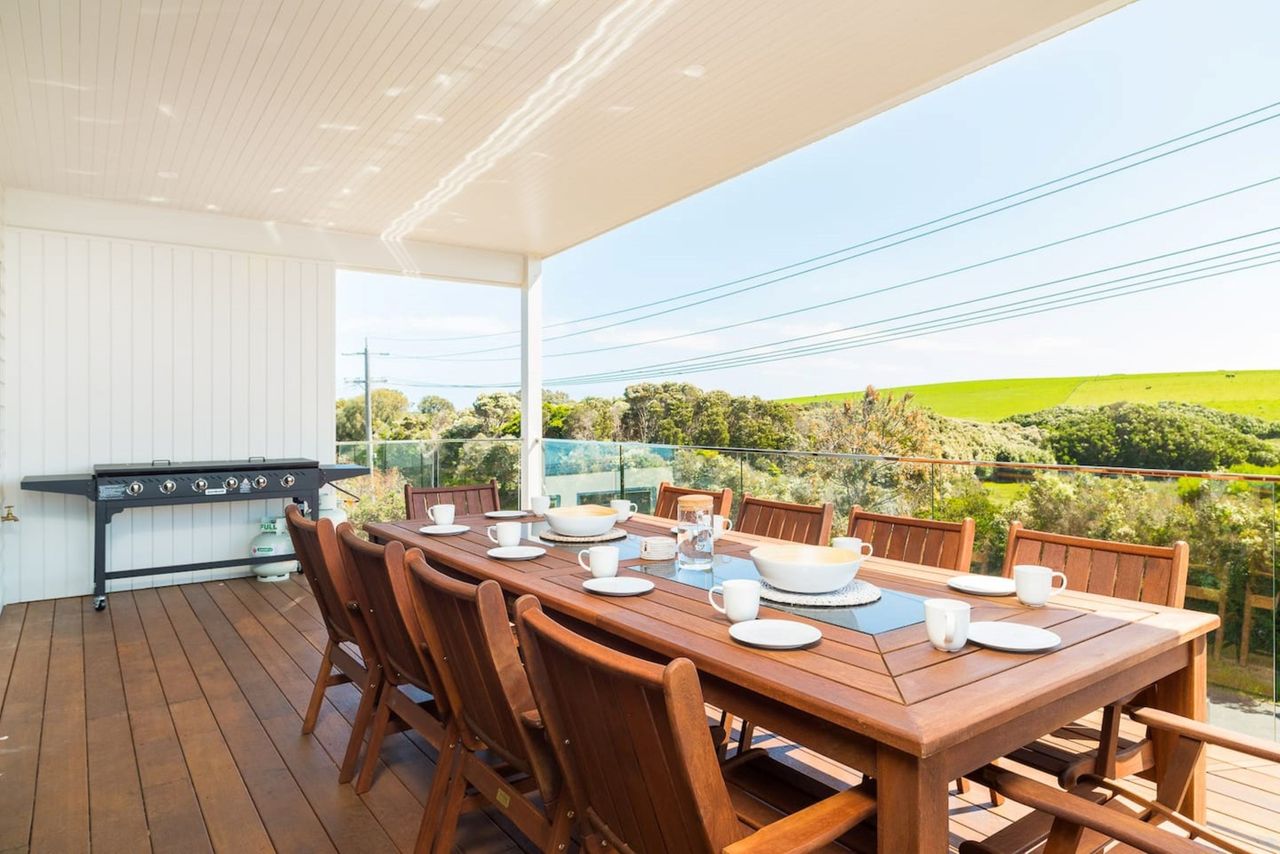 Upstairs comprises the modern open plan kitchen, dining and living area, with large sliding doors opening onto the covered balcony. Enjoy the sunny open space with soft comfortable couches and large tv with sound bar, including Bluetooth, and a Chromecast with Google tv. The balcony faces west for the afternoon sun, overlooking reserve parkland and the hills of farm paddocks frequented by kangaroos. On the balcony there is also a BBQ and outdoor table. The dining table seats 8 and the balcony table seats 8.