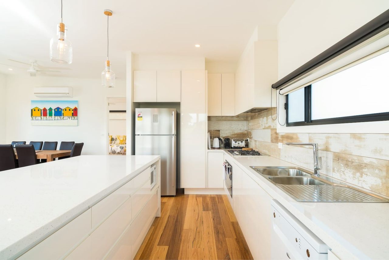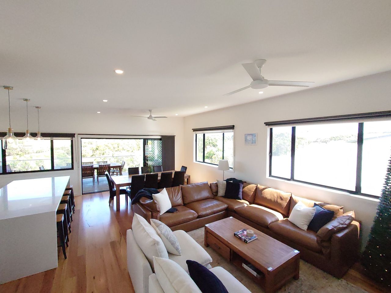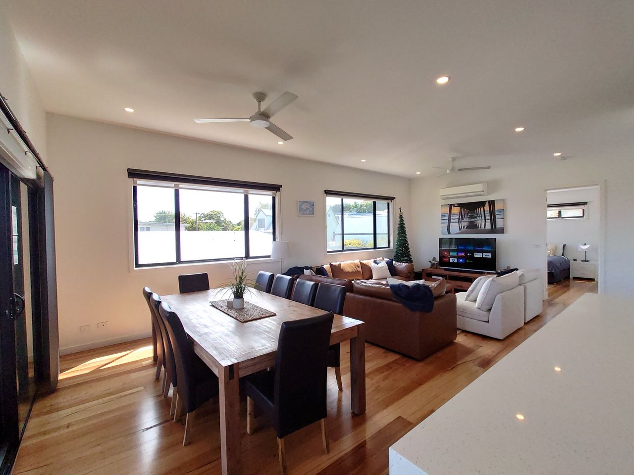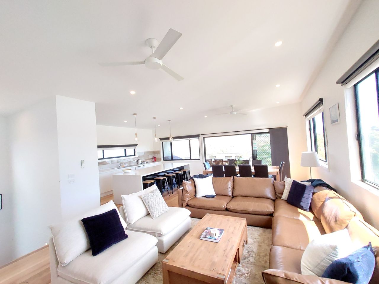 Upstairs comprises the modern open plan kitchen, dining and living area, with large sliding doors opening onto the covered balcony. Enjoy the sunny open space with soft comfortable couches and large tv with sound bar, including Bluetooth, and a Chromecast with Google tv. The balcony faces west for the afternoon sun, overlooking reserve parkland and the hills of farm paddocks frequented by kangaroos. On the balcony there is also a BBQ and outdoor table. The dining table seats 8 and the balcony table seats 8.