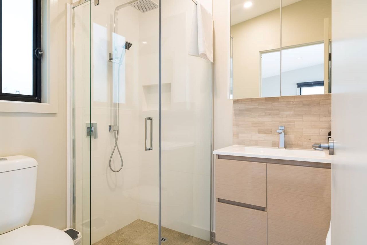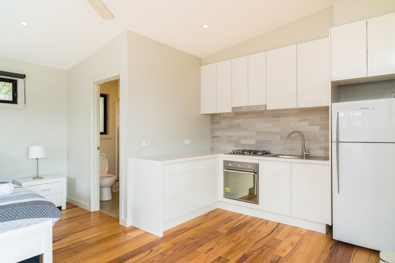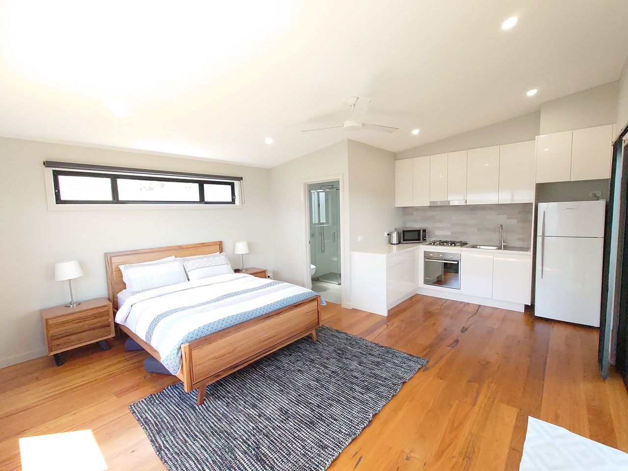 An added bonus is the freestanding queen bed studio offering a bathroom with shower & toilet, and its own sheltered deck. The studio kitchenette contains an electric oven with a gas cooktop, plus a sink and fridge.