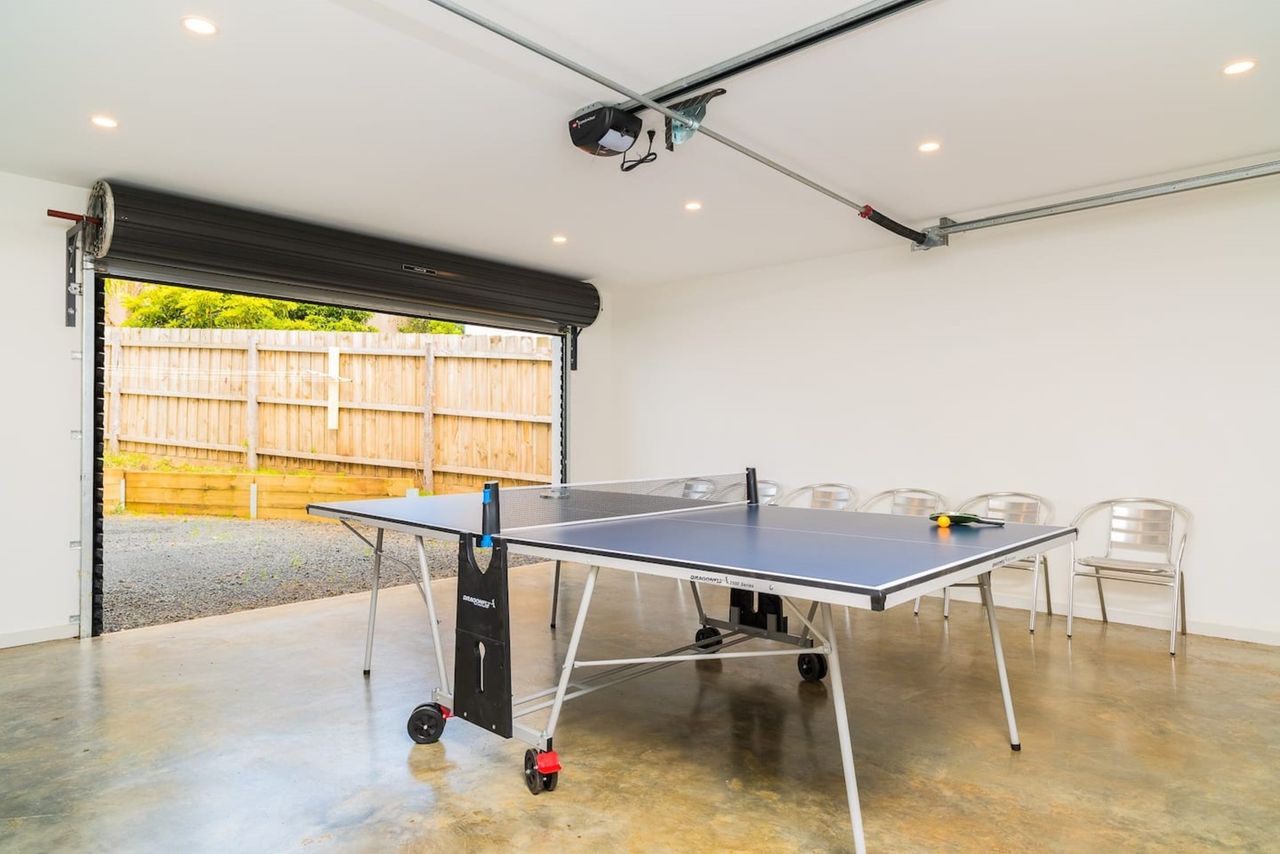 The garage is set up for fun, with a table tennis table, a TV with Chromecast with Google TV, a big Bluetooth speaker and more couches! On hot days the front and rear garage doors can be opened to let the breeze through. Parking is available in the driveway and outside the property.