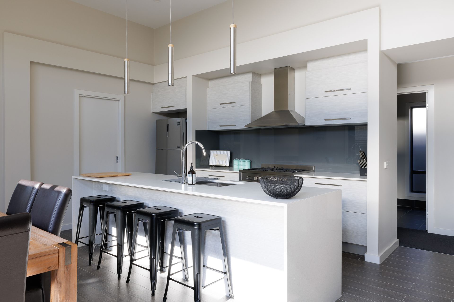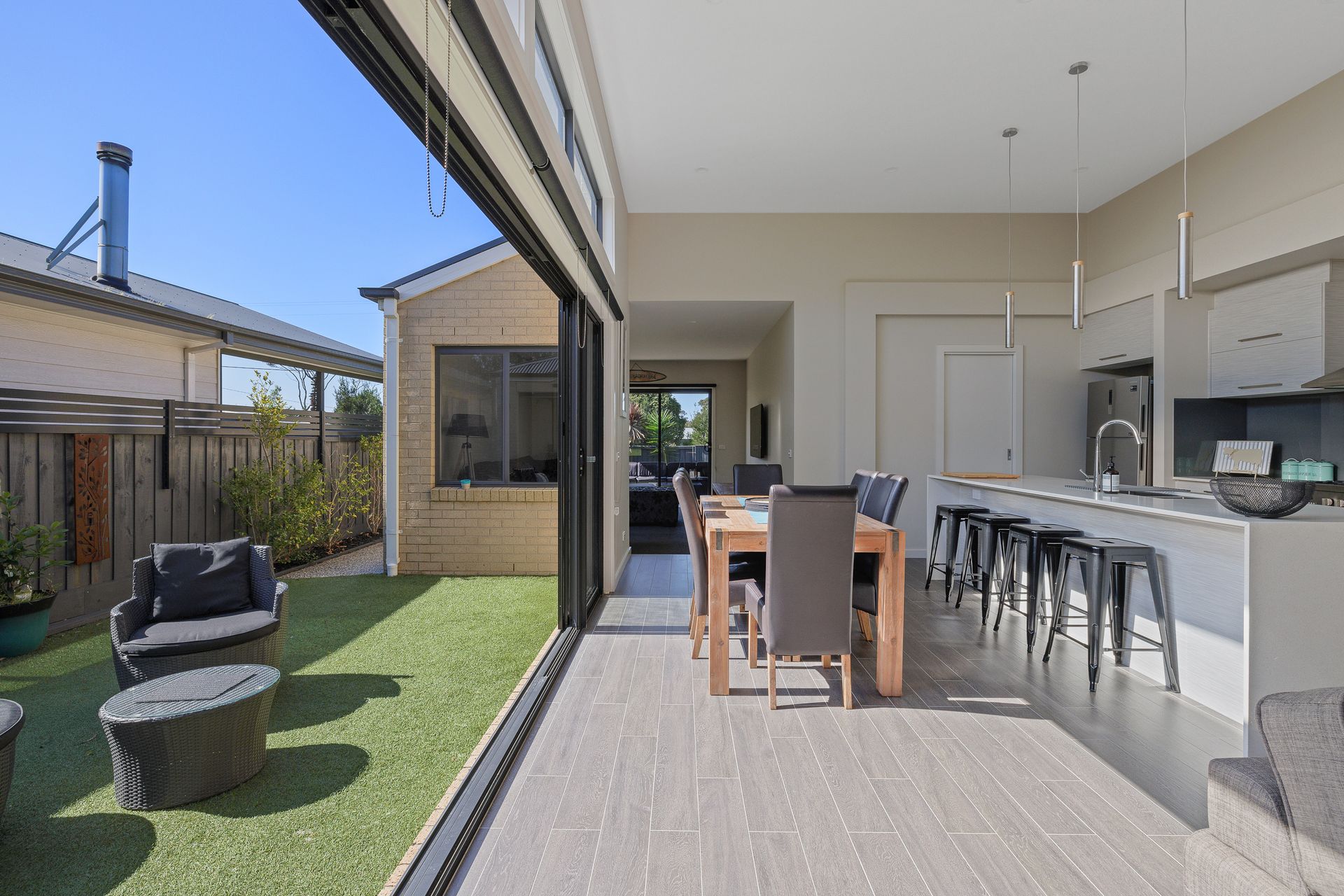 The open plan living area has a well equipped kitchen with a dishwasher and the dining table seats 6 with an additional 4 stools at the kitchen bench so everyone can eat together. Cosy up by the fireplace on those chilly winter nights or snuggle up on the couch in the main loungeroom and watch a movie.