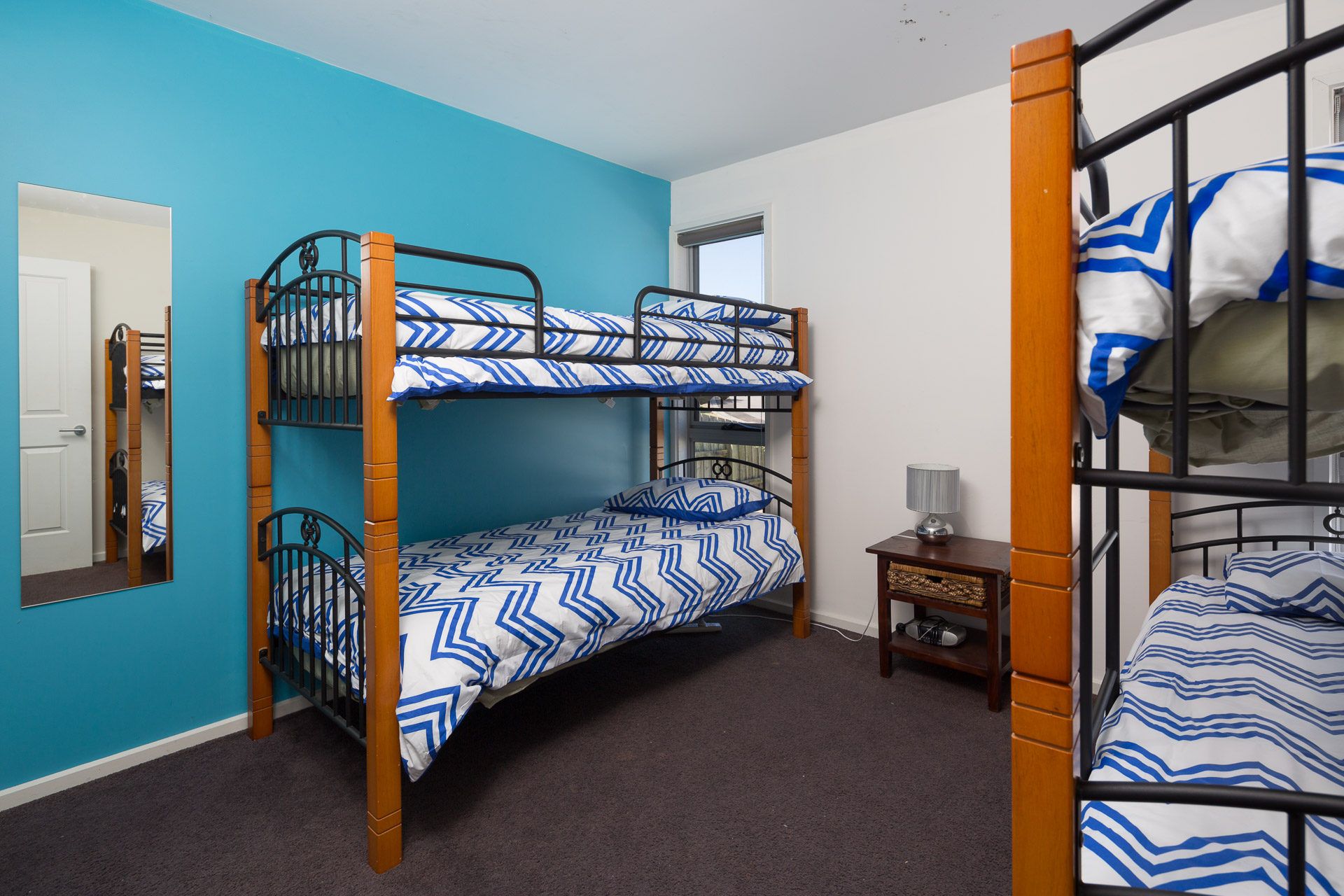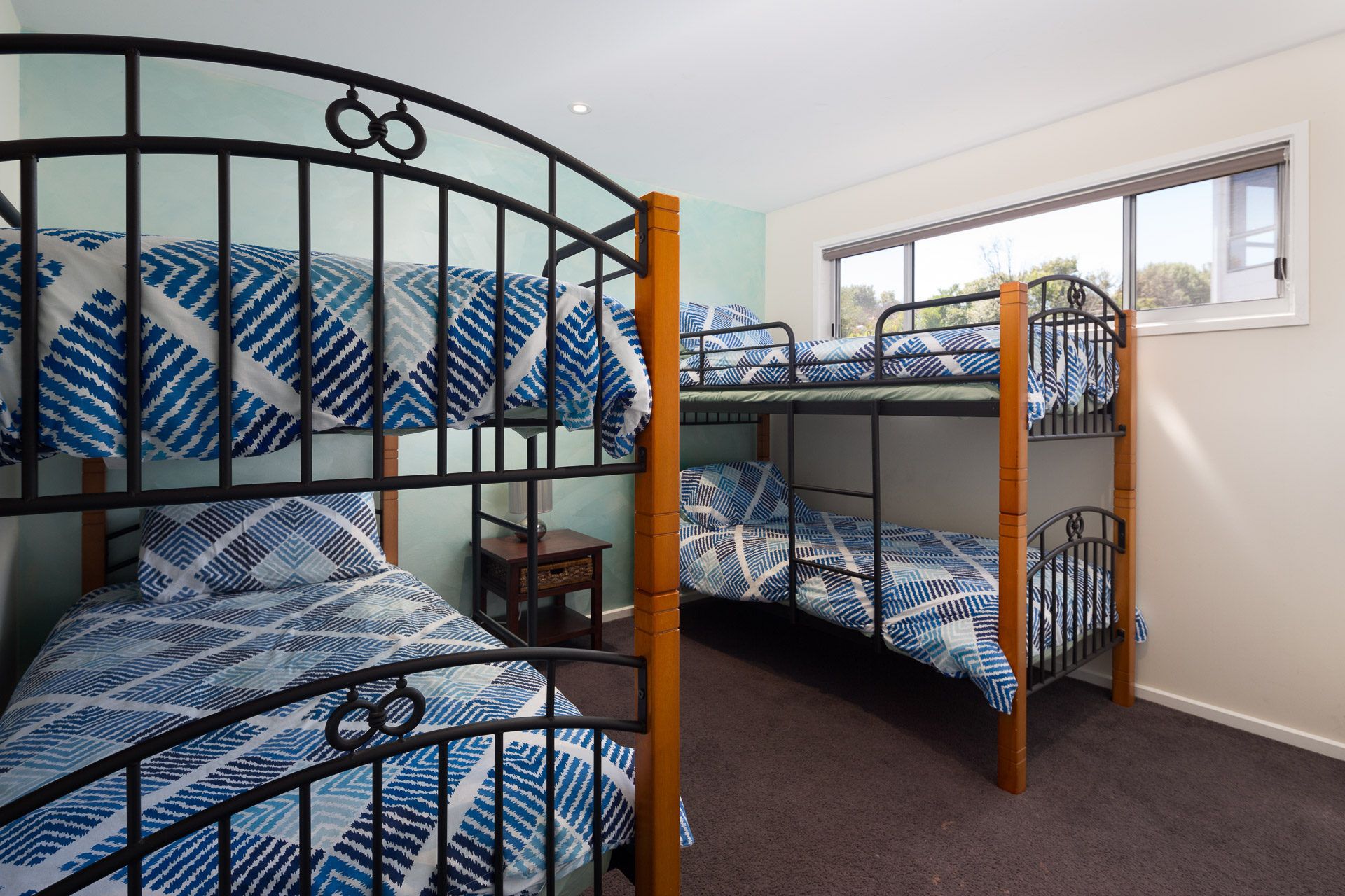 The two downstairs bedrooms both have a queen bed and a single set of bunk beds in each.
