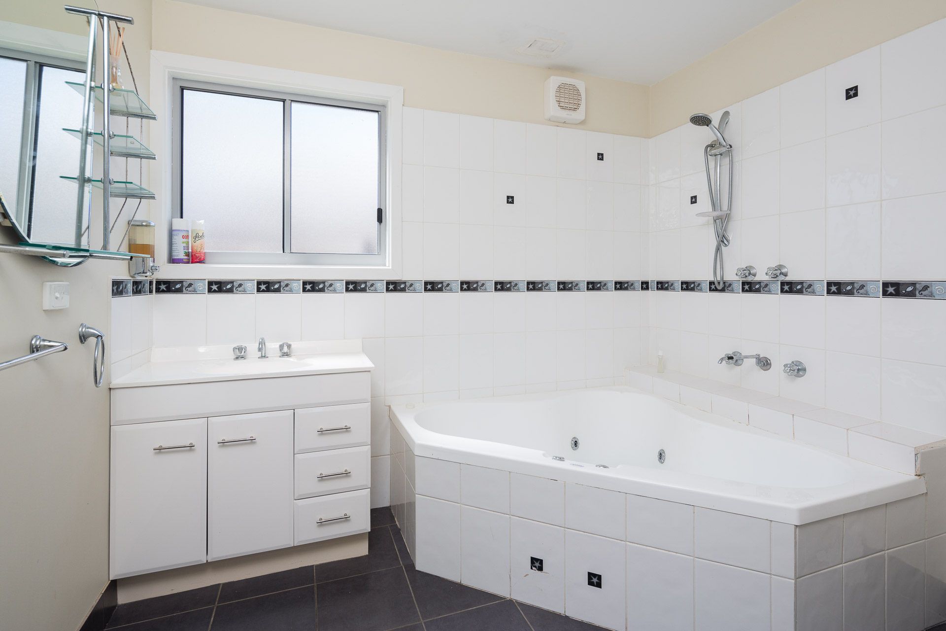 Downstairs is the second bathroom, complete with a lovely, relaxing 3 person spa bath, an overhead shower, vanity, mirror and toilet. The laundry contains a front loading washing machine. The property has two gas heaters, one upstairs and one downstairs.