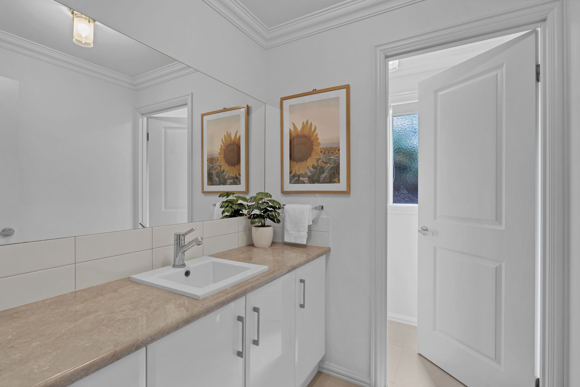 The stylish kitchen is a chef's dream, featuring unique stone benchtops and premium stainless steel appliances, whilst the private primary suite is your own peaceful retreat, tucked behind the kitchen for complete seclusion. It boasts a generous walk-through robe and a luxurious ensuite with twin rain showerheads in the double-volume shower—perfect for ultimate relaxation. A well-appointed laundry with direct external access and a double garage with a remote roller door, internal access, and pedestrian backyard access complete the lower level.