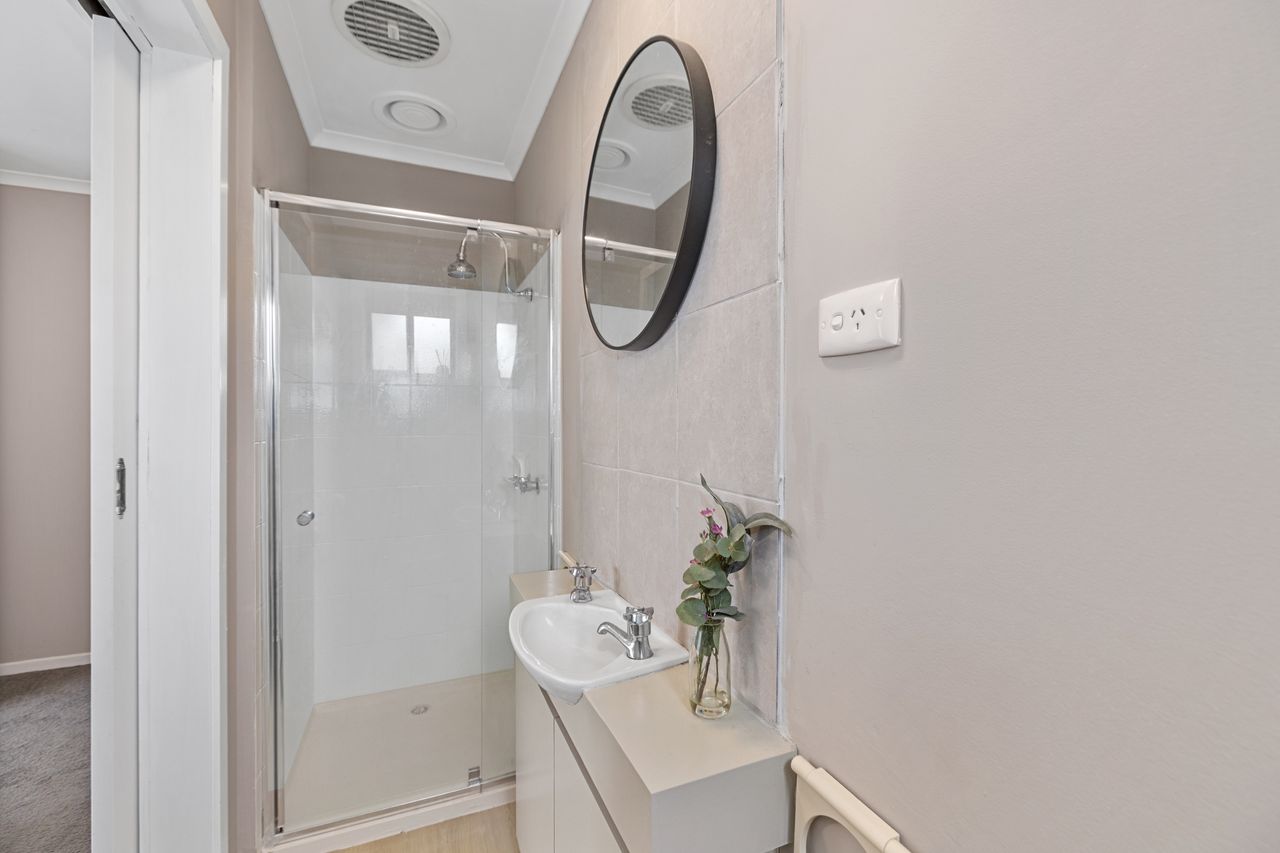 Sleeping up to 5 guests, the master bedroom has a queen bed, walk-in robe, and ensuite, while the second bedroom offers two king singles and the third a single bed. A central bathroom includes shower, bath, and separate toilet, plus a laundry with washing machine and external access.