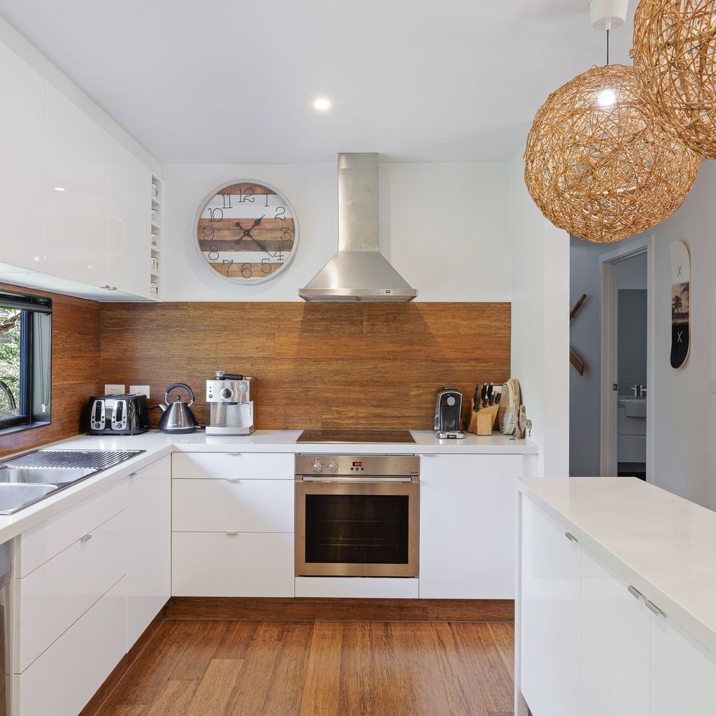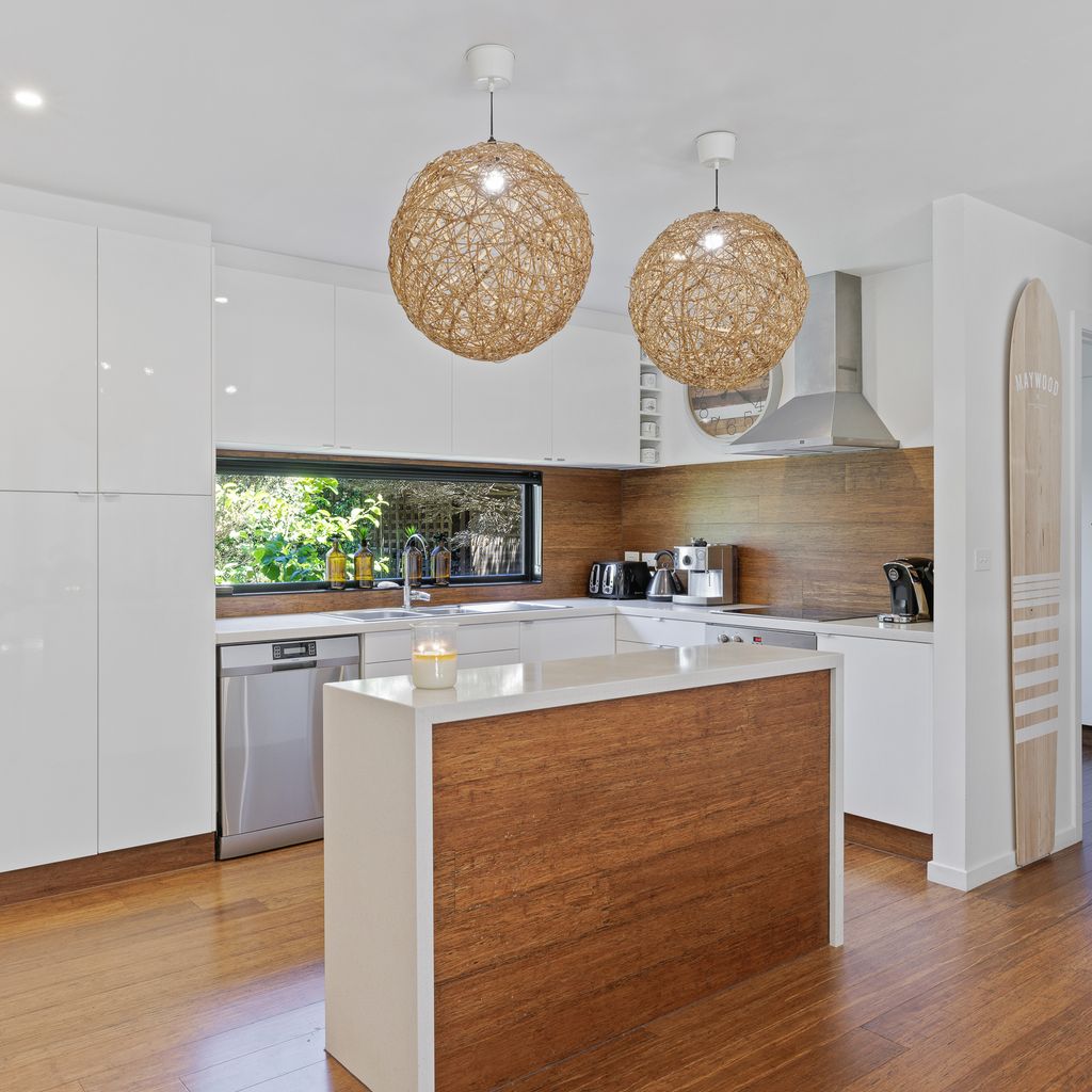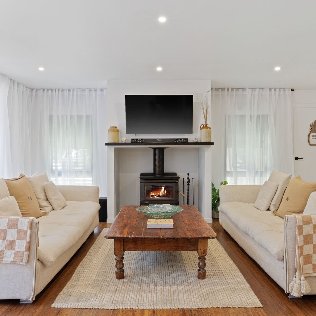 The front is fenced off and is nice and private. All of the bedrooms have ceiling fans and Tv's. The open plan living has Tv dvd, split system, wood fire, lounge and dining. The timber floors are low maintenance. The well equipped kitchen has ceaser stone benchtops, dishwasher, electric oven and cooktop, stools at the island bench and coffee machine.