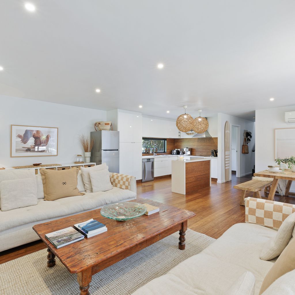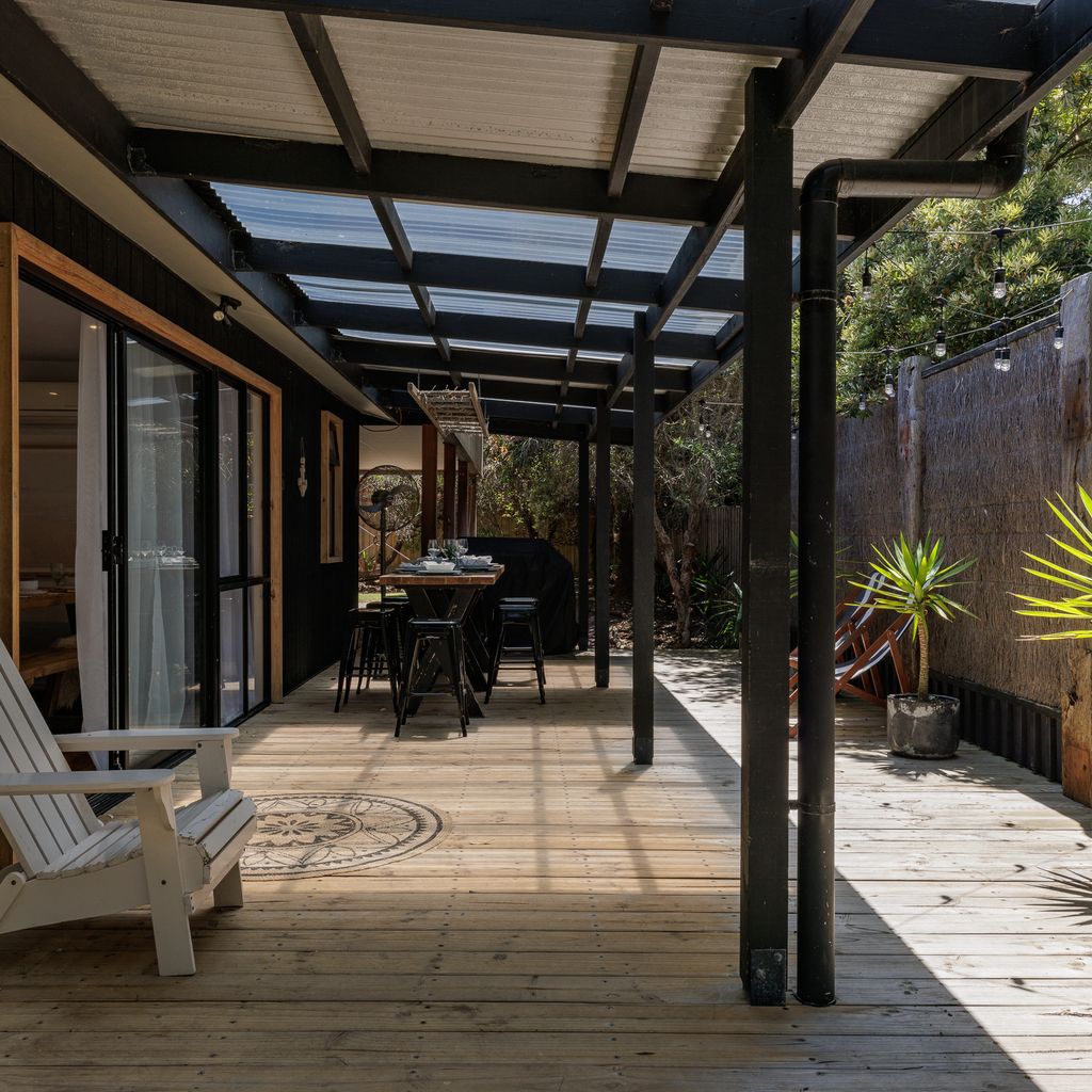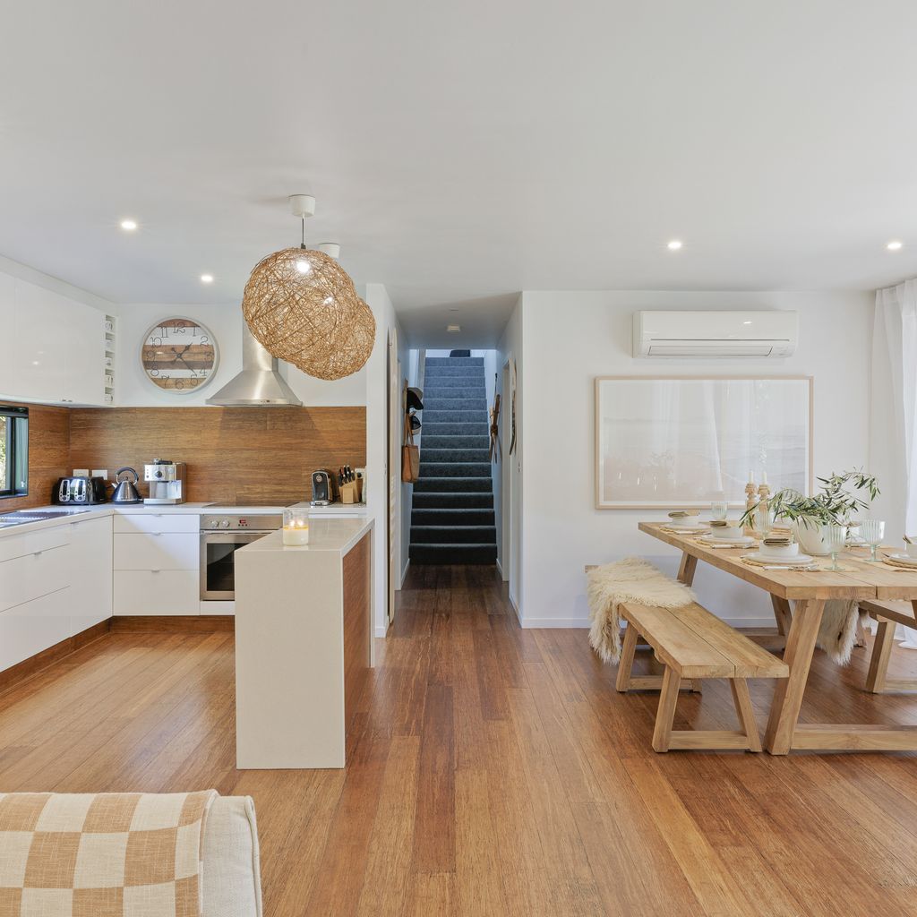 The front is fenced off and is nice and private. All of the bedrooms have ceiling fans and Tv's. The open plan living has Tv dvd, split system, wood fire, lounge and dining. The timber floors are low maintenance. The well equipped kitchen has ceaser stone benchtops, dishwasher, electric oven and cooktop, stools at the island bench and coffee machine.