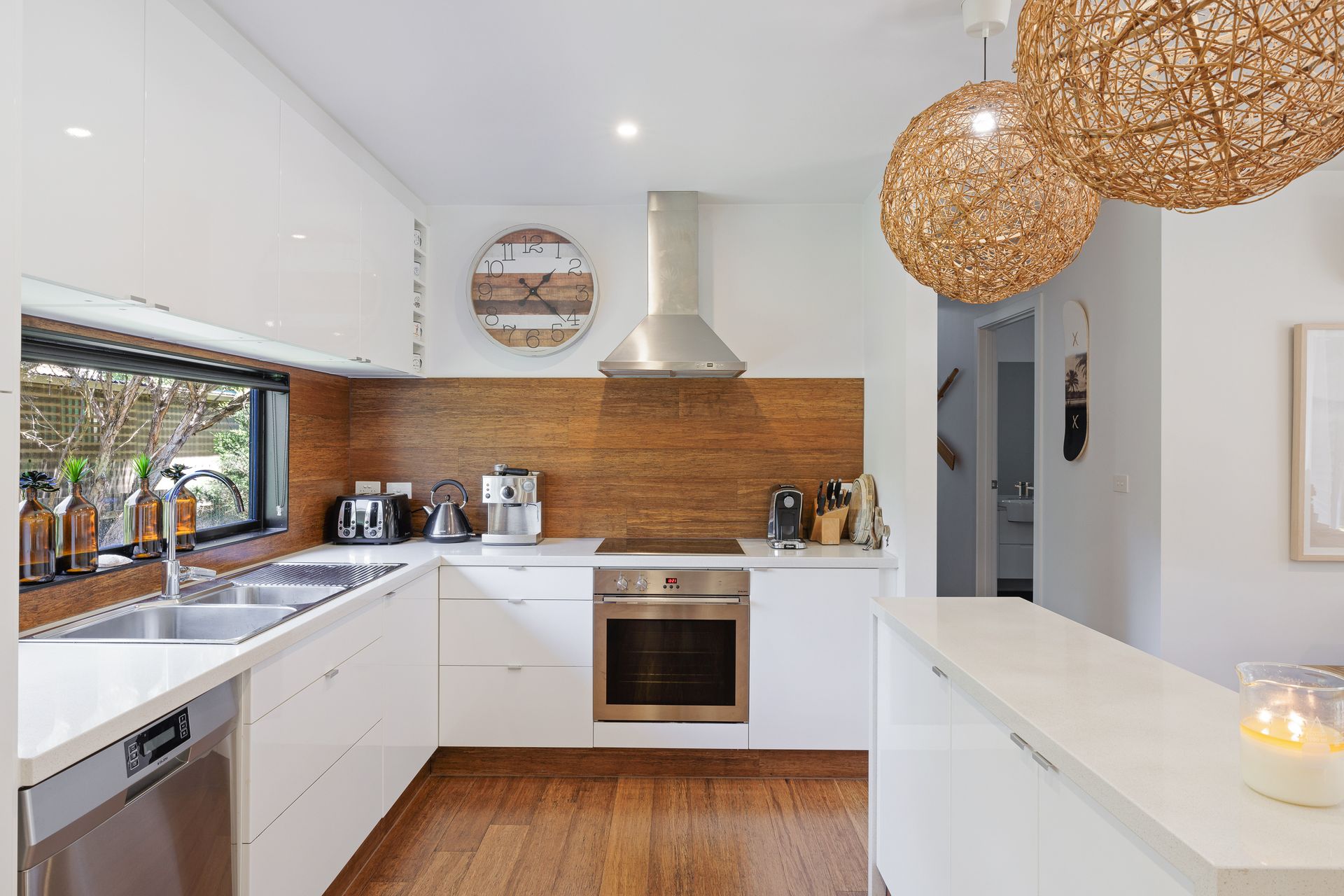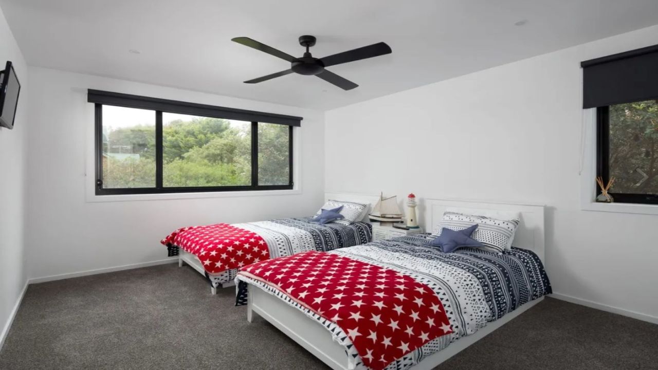 The front is fenced off and is nice and private. All of the bedrooms have ceiling fans and Tv's. The open plan living has Tv dvd, split system, wood fire, lounge and dining. The timber floors are low maintenance. The well equipped kitchen has ceaser stone benchtops, dishwasher, electric oven and cooktop, stools at the island bench and coffee machine.